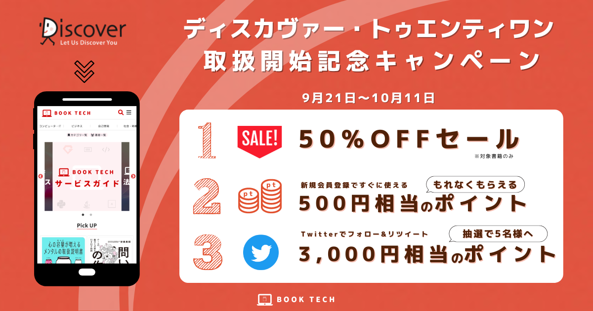株式会社ディスカヴァー・トゥエンティワン(本社:東京都千代田区、取締役社長:谷口奈緒美)は、2022年9月21日から、BOOK TECH株式会社(本社:東京都千代田区、代表取締役:菅健介)が運営する「BOOK TECH」にて弊社刊行の電子書籍の販売を開始します。これに際し、取り扱い開始記念キャンペーンを開催します。
