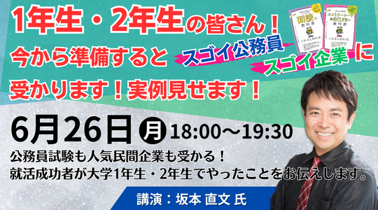 公務員、日商簿記検定、税理士、公認会計士などの資格取得に向けた教育サービスを展開しているTAC株式会社(東京都千代田区、代表取締役社長:多田敏男)は、6/26(月)に『1年生・2年生の皆さん!今から準備すると【スゴイ公務員、スゴイ企業】に受かります!実例見せます!』を開催します。講師には、就職コンサルタントであり、就職講座での指導歴20年以上の坂本直文氏をお招きします。