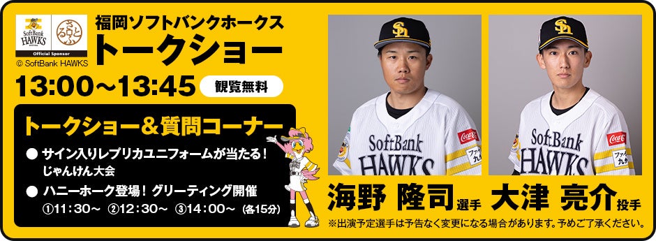 さらに、福岡ソフトバンクホークス 海野隆司選手、大津亮介投手による「トークショー&質問コーナー」を開催します。サイン入りレプリカユニフォームが当たるじゃんけん大会や、福岡ソフトバンクホークスのマスコットキャラクター「ハニーホーク」が登場するグリーティングも実施予定です。
