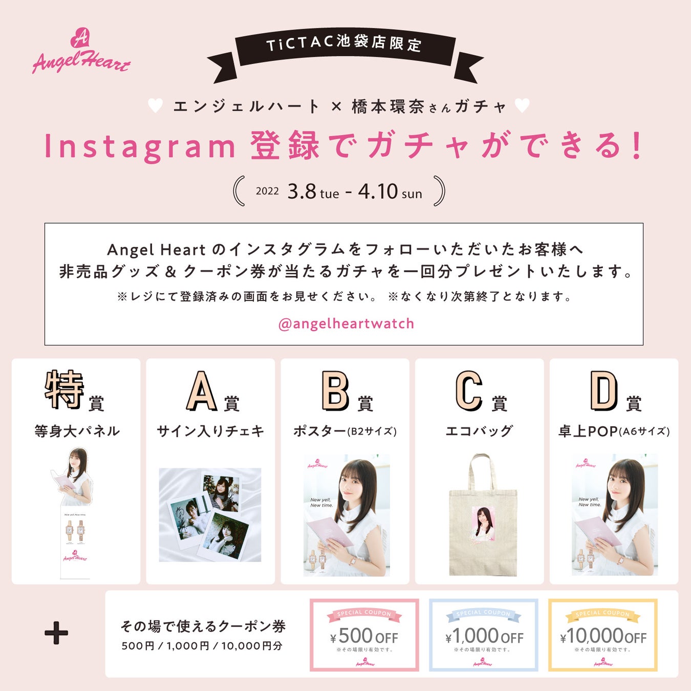 内容:店頭にてエンジェルハートの公式SNSをフォローすると、お一人様1回ガチャを回すことができ、橋本環奈さんのグッズと腕時計のクーポン券が当たります。