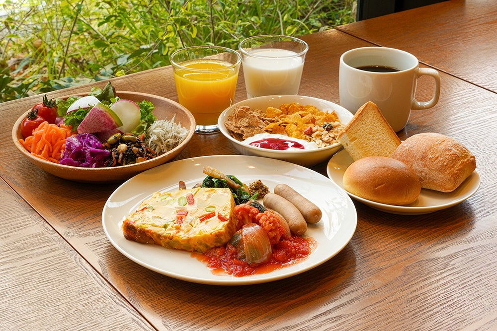 地元食材である「鎌倉しらす」や「鎌倉海藻ポーク」等を使用したメニューをご用意します。選べるメイン料理として、「干物と豚汁の定食」もしくは、「アメリカンブレックファースト」、「2種のあいがけカレー」からお選びいただけます。ブッフェコーナーでは、各種パン・ソフトドリンク・シリアルや、ヨーグルトをご自由にお取りいただけます。