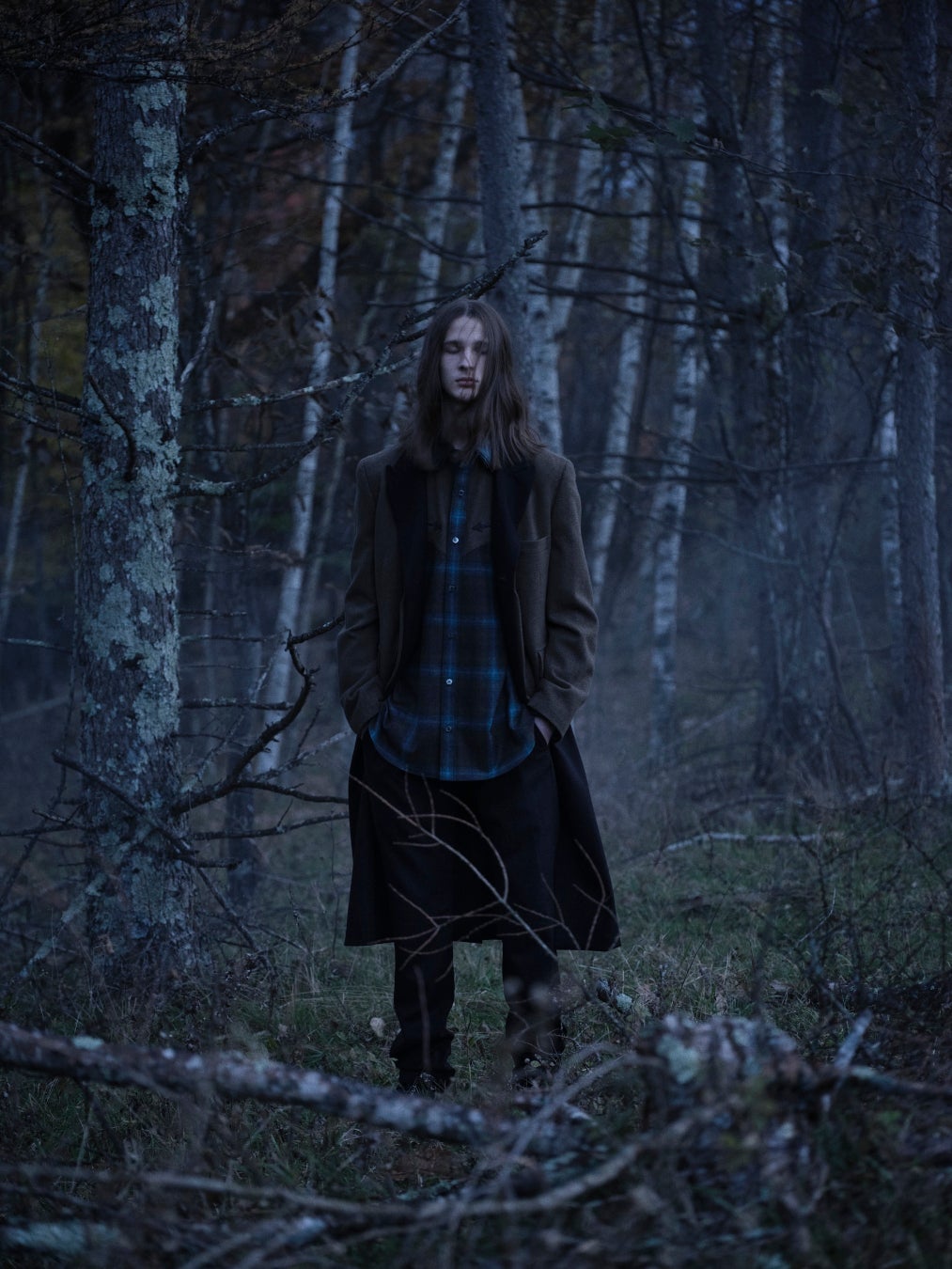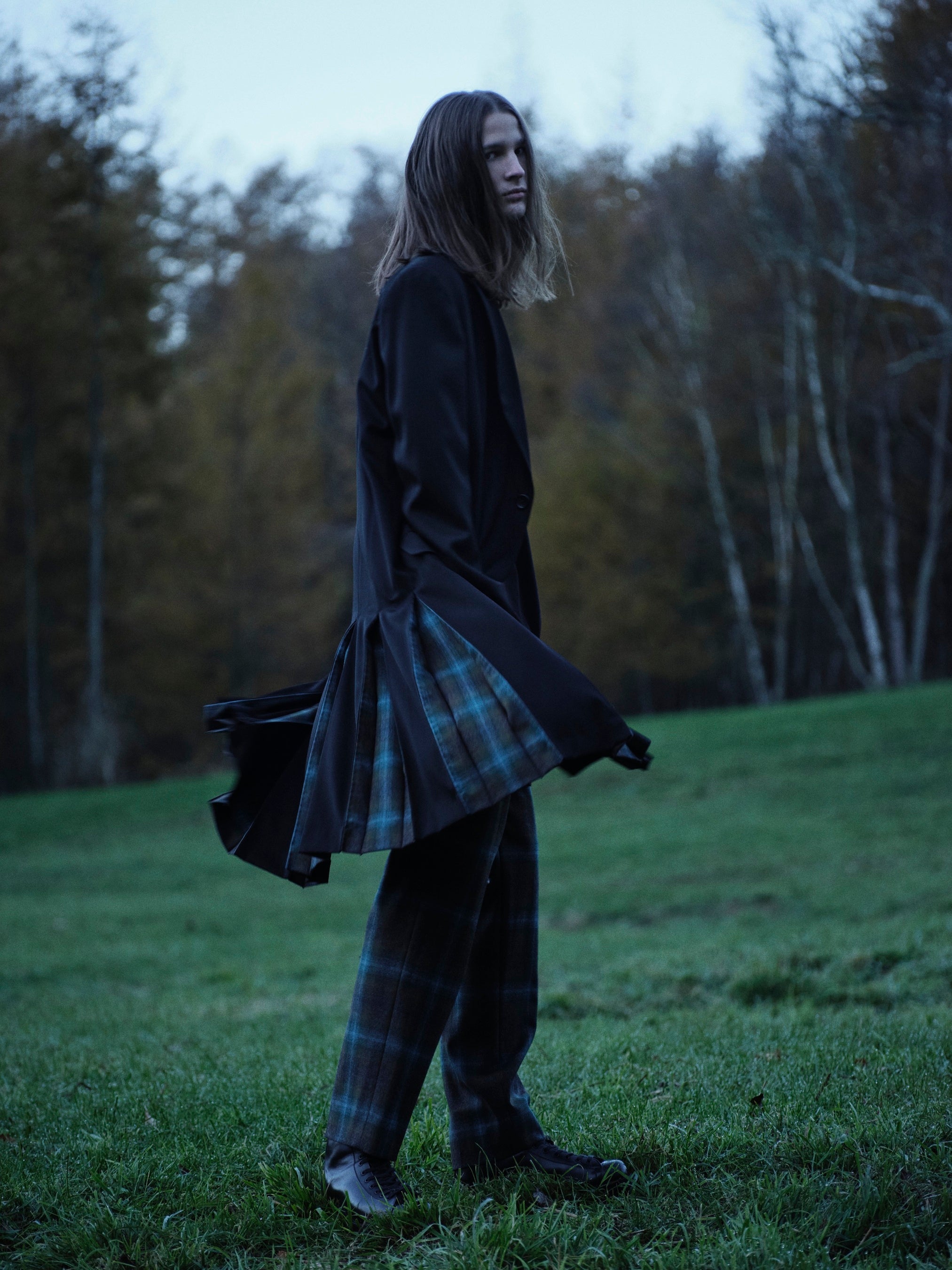 本コレクションでは、Yohji Yamamoto POUR HOMME 2008‑09AWランウェイに登場したチェック柄アイテムを再構築し、ジャケット、シャツ、パンツを展開します。ブランケットのように贅沢にチェック生地を用いた分量感のあるストールジャケットや、レイヤード構造のジャケット、プリーツ部分にチェック生地を縫い込んだジャケットなど、ロング丈のジャケットに細身シルエットのパンツを組み合わせています。希少なUSメイドのペンドルトンチェック生地のオーセンティックで温かみのある表情を、ヨウジヤマモトならではのシルエットやデザインと組み合わせ、新たなスタイルとして提示します。