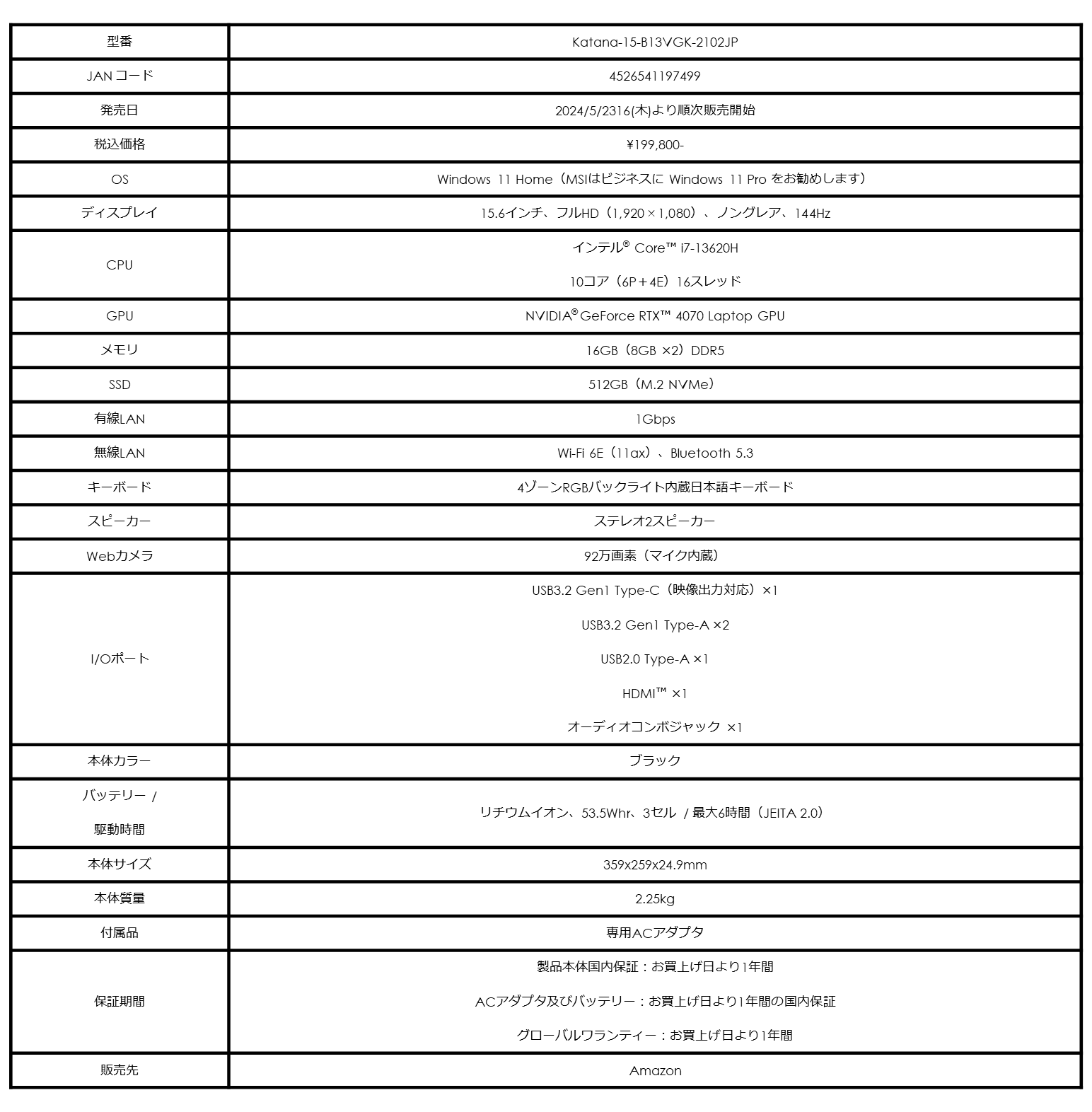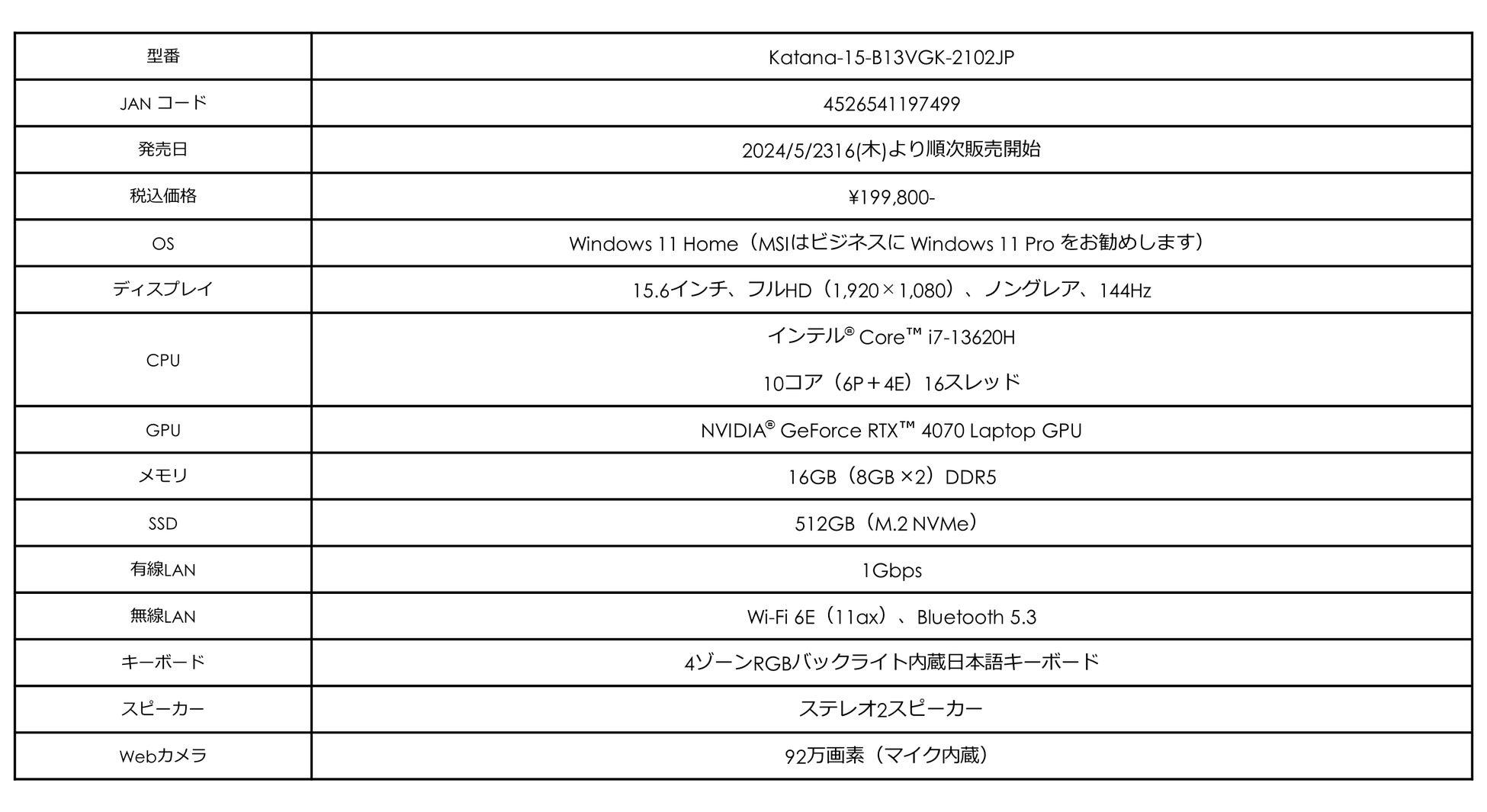 ・Katana 15 B13V シリーズ製品ページ:https://jp.msi.com/Laptop/Katana-15-B13VX