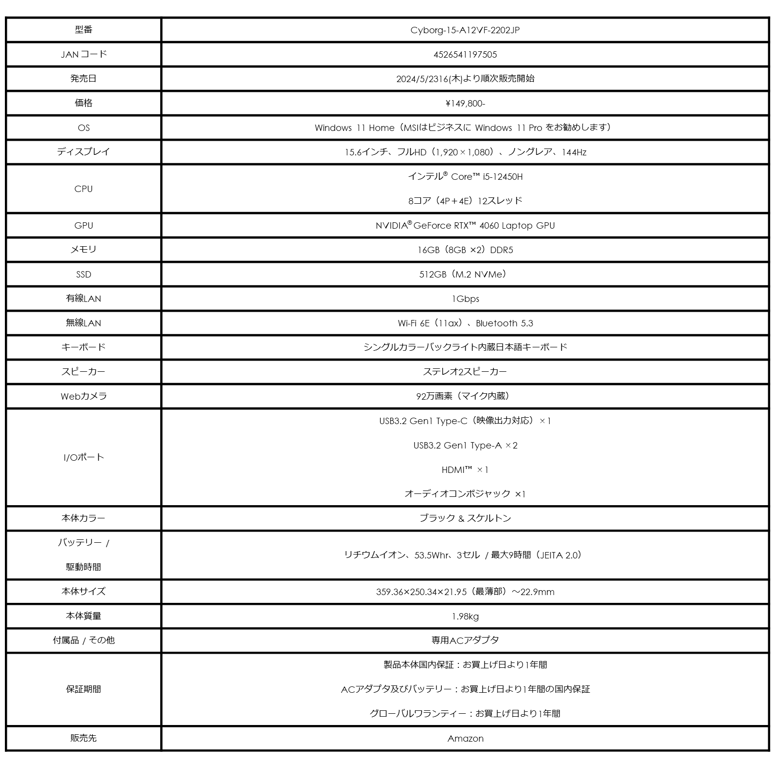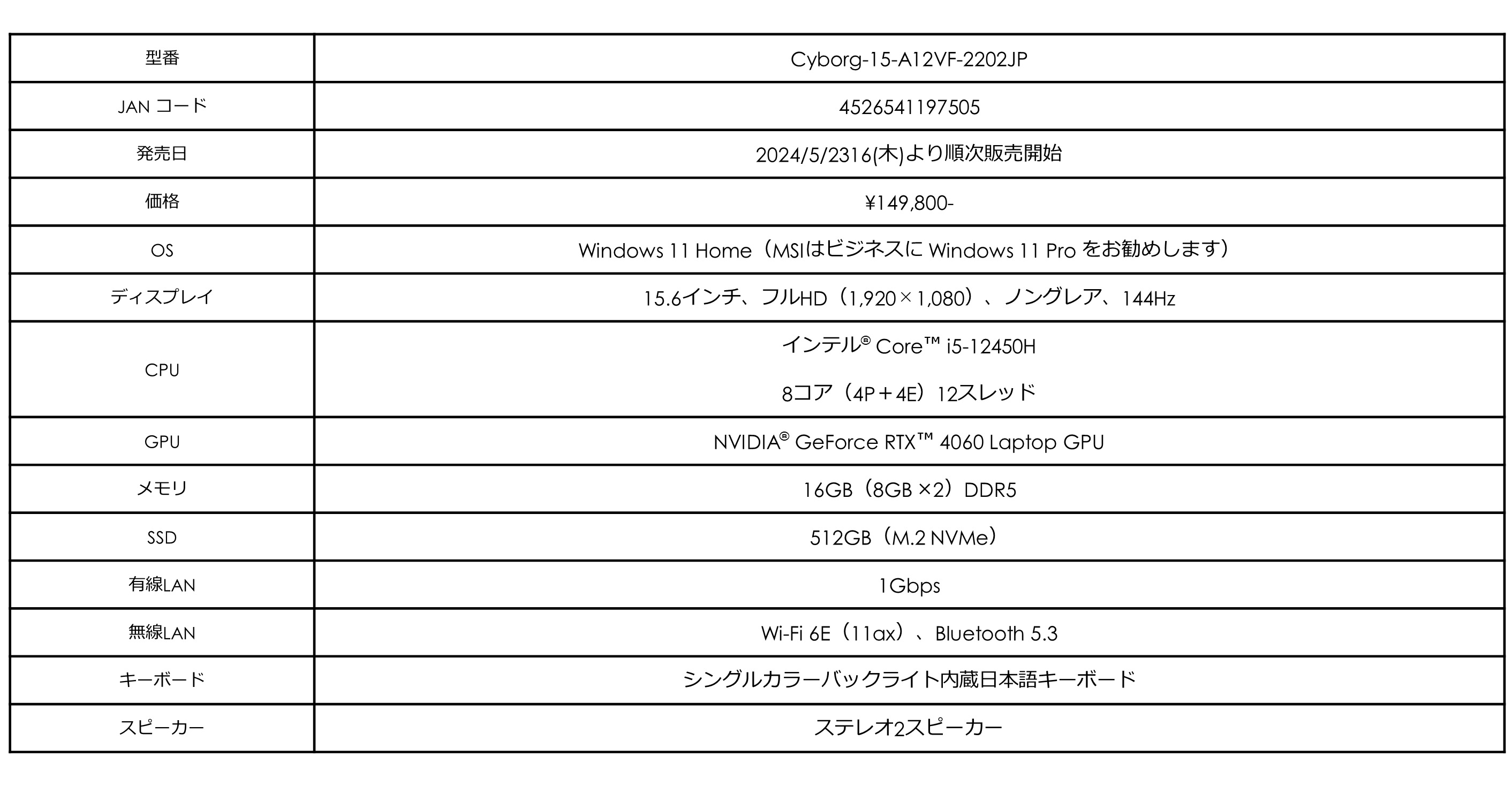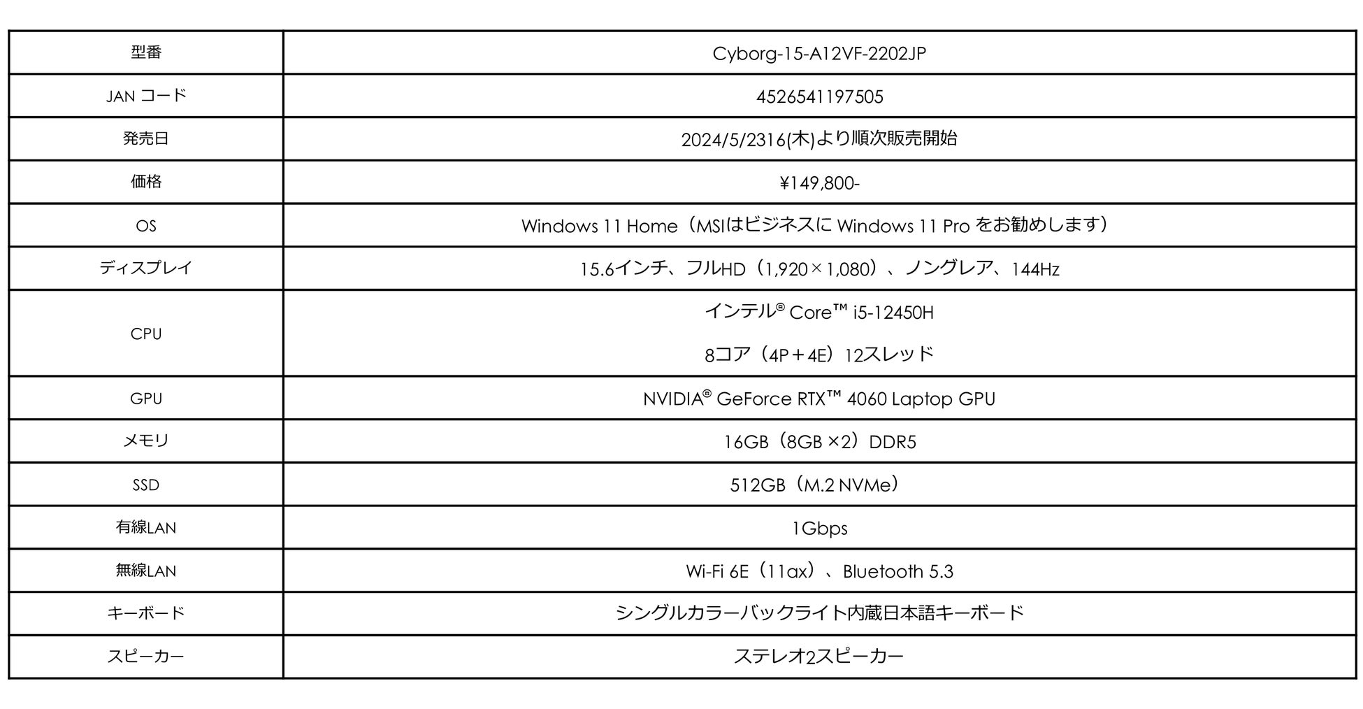 ・Cyborg 15 A12V シリーズ製品ページ:https://jp.msi.com/Laptop/Cyborg-15-A12VX