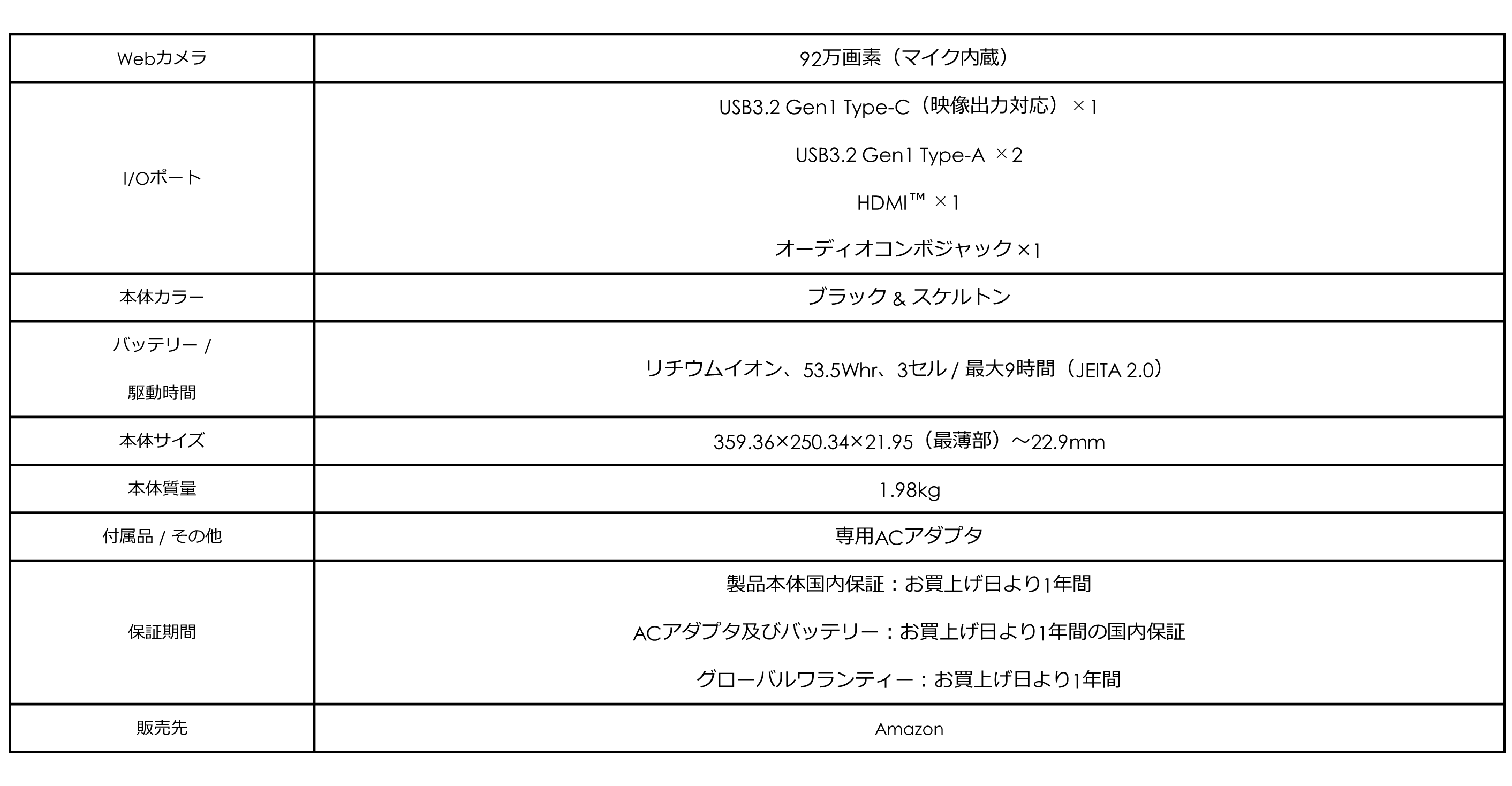 本体デザインの大きな特徴として、ディスプレイ側面や本体底面にスケルトンカバーを採用するほか、WASDや方向キーなどにスケルトンキートップを搭載し、他にはない独特な個性を放ちます。本体は薄さ22.9mm・軽さ1.98kgの薄型・軽量デザインとなっており、室内の移動やバックパックへ収納して外出先へ気軽に持ち運ぶことができます。