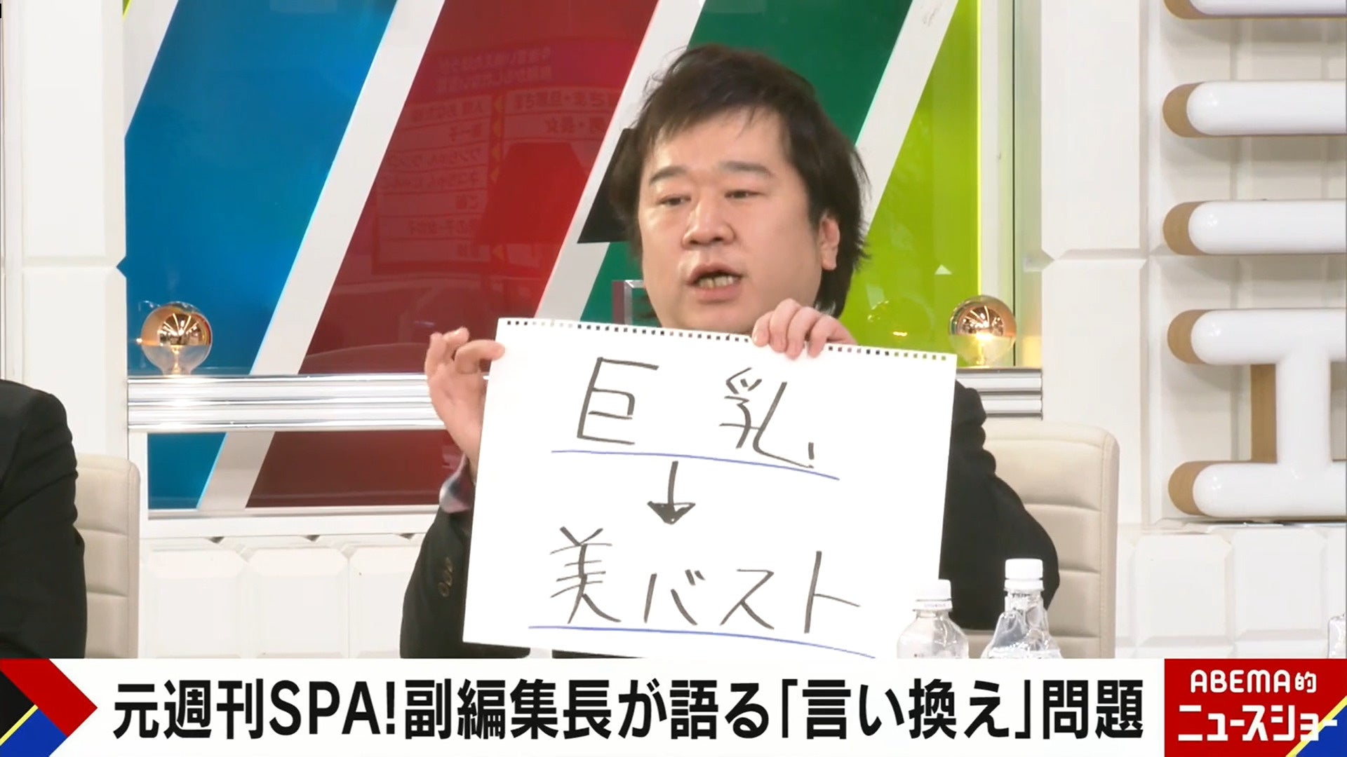 また、元雑誌副編集長の田辺健二さんが近年使用できなくなっている言葉を紹介。田辺さんは「“巨乳”という言葉を使うと、今はネットで弾かれちゃう。ネット記事のタイトルをよく見てください!みんな“美バスト”なんです。完全に言い換えています」と伝えると、でか美ちゃんは「改名して良かった~!」と安堵。