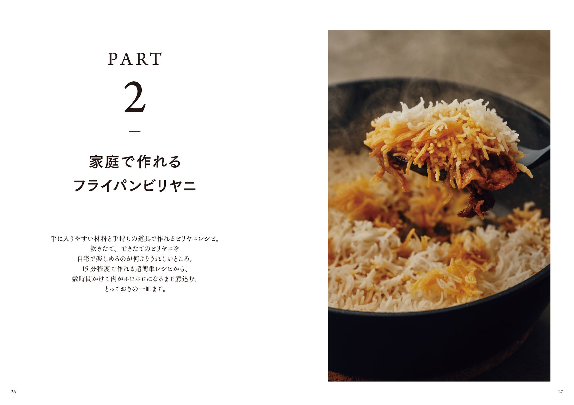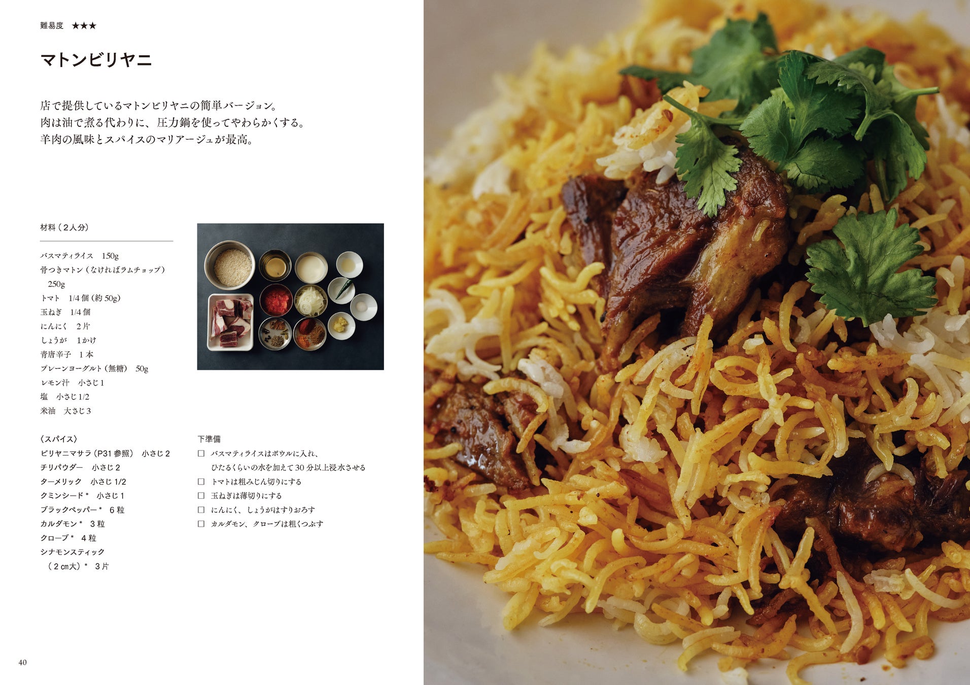 定番の「チキンビリヤニ」「マトンビリヤニ」はもちろん、「明太子ビリヤニ」「豚キムチビリヤニ」といった変化球、さらに炊飯器で作れるビリヤニやレトルトカレーを使ったビリヤニなど、家庭向けのビリヤニを18種紹介しています。この一冊があれば、大澤氏が「もっともおいしい」と言う“炊き立てのビリヤニ”をご家庭で食べられるのです! また、店舗で実際に提供している「マトンビリヤニ」のレシピを手順の一つ一つまで詳細に紹介しています。