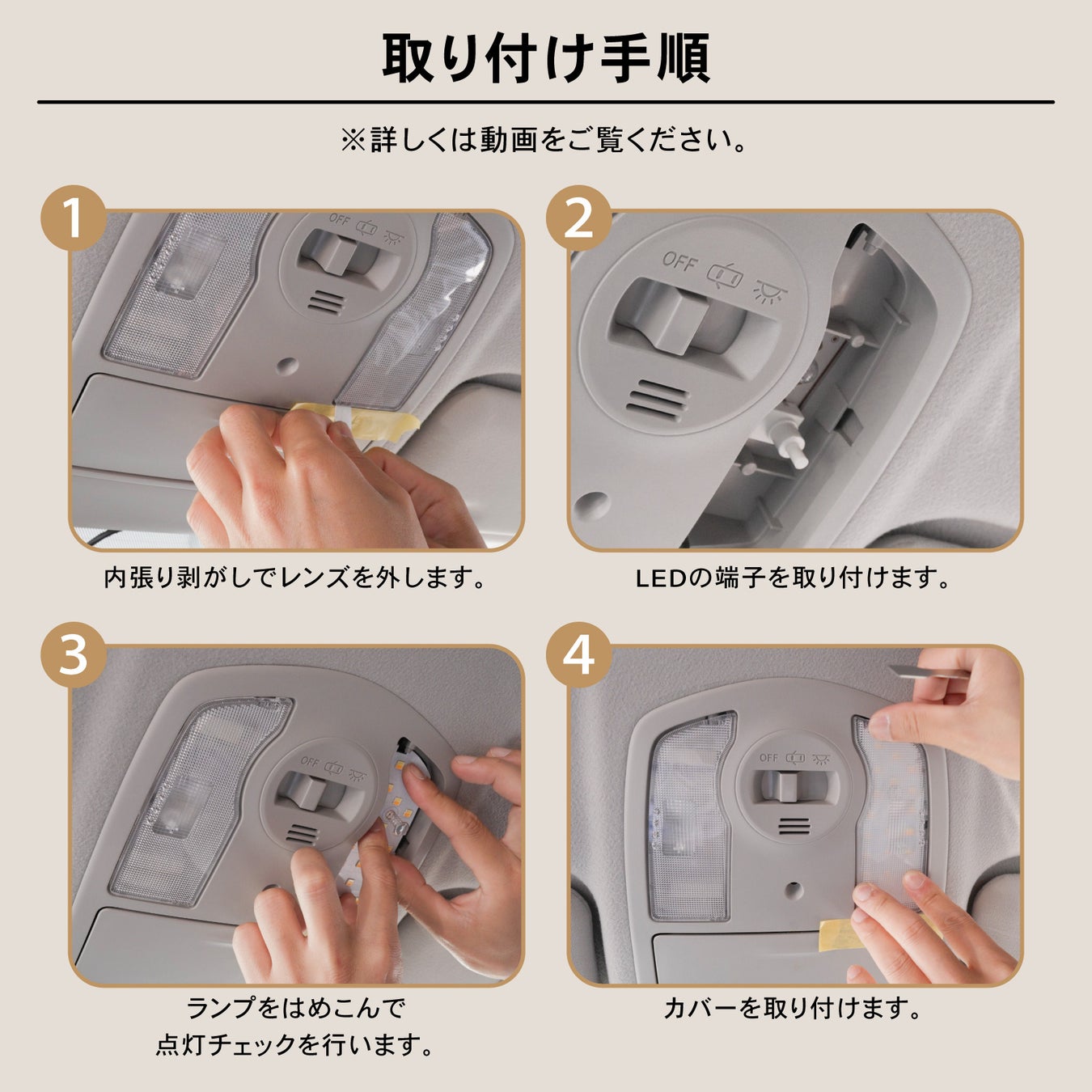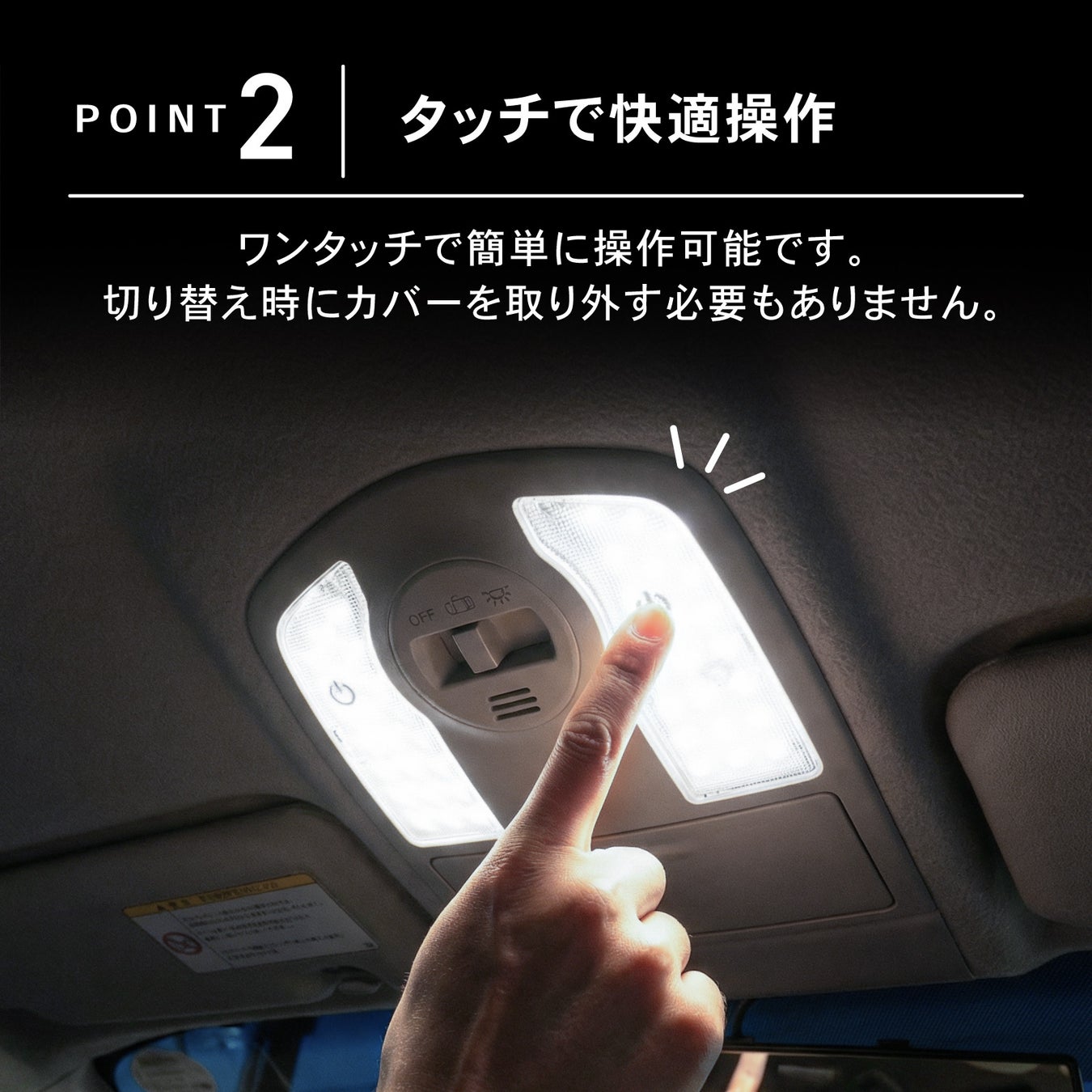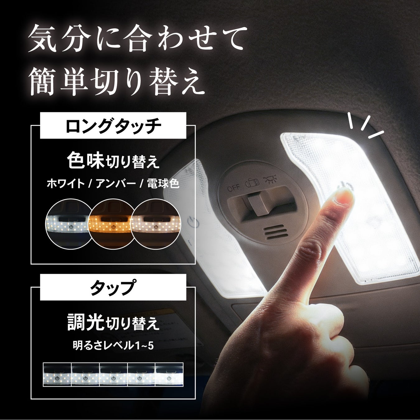 従来のLEDルームランプでは明るさや色を切り替える際、一度レンズカバーを取り外す必要がありました。「取り付けた後、状況に合わせて手軽に明るさを変えたい!」というユーザー様の声に応え、本製品は、カバーの上から触れるだけで直感的に操作できる仕様になっております。