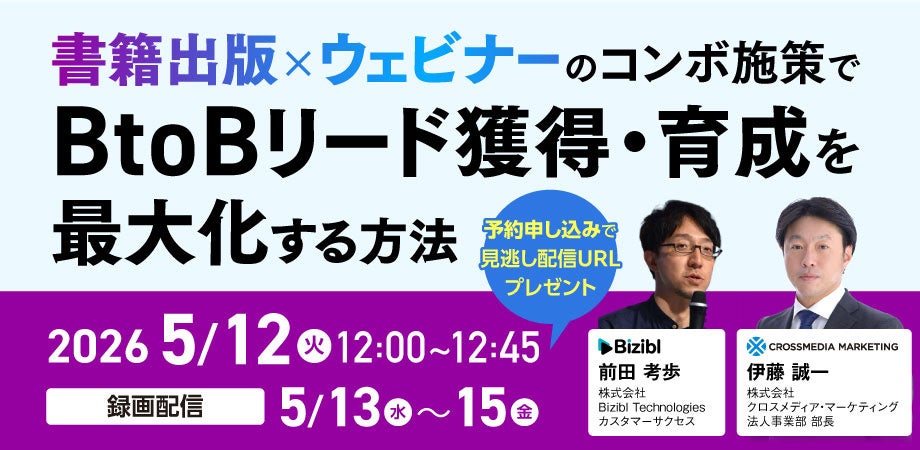 株式会社クロスメディア・マーケティング(本社:東京都渋谷区 代表取締役:小早川 幸一郎)は、株式会社Bizibl Technologies(本社:東京都千代田区、代表取締役:花谷 燿平)が2026年5月12日(火)から5月15日(金)に開催するウェビナー「書籍出版×ウェビナーのコンボ施策でBtoBリード獲得・育成を最大化する方法」に登壇いたします。