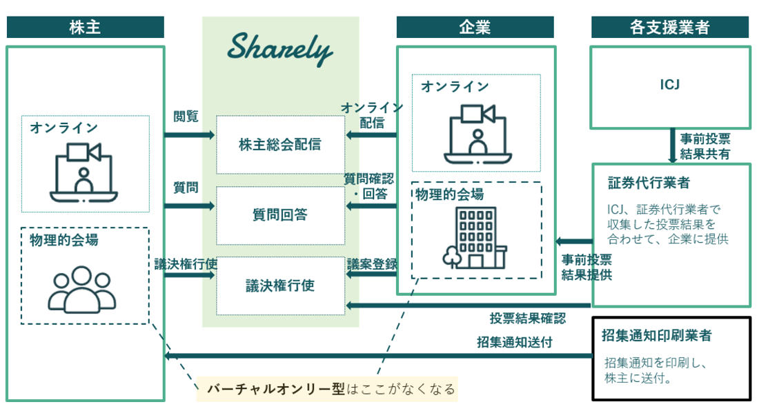 Sharelyはバーチャル株主総会の開催・運営を総合的に支援するサービスです。「参加型」から「出席型」「バーチャルオンリー型」まで、バーチャル株主総会に幅広く対応可能なクラウドシステムの提供に加え、バーチャル株主総会に合わせたシナリオや運営方法の提案、株主総会当日の運営サポートなどを提供しています。