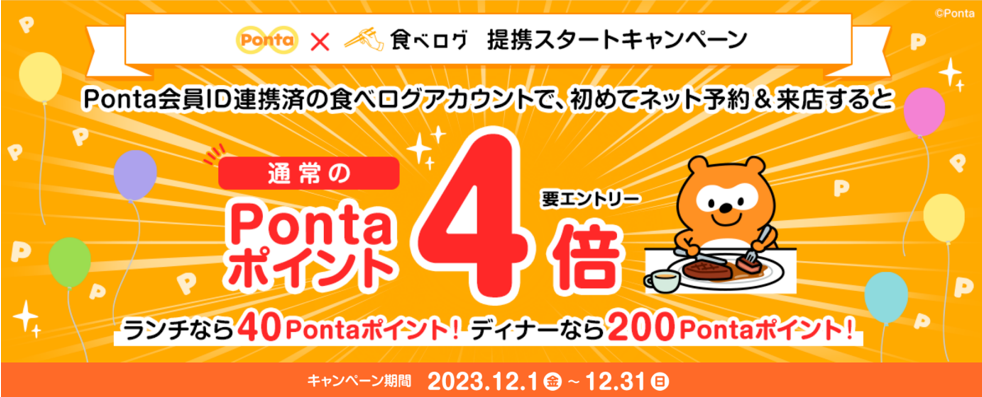 期間中、食べログIDとPonta会員IDを連携したお客さまが特設ページからエントリーの上、「食べログ」のネット予約サービスを利用してネット予約し、2024年2月29日までに来店いただくと、通常の4倍のPontaポイント(ディナーの予約で1名につき200Pontaポイント、ランチの予約で1名につき40Pontaポイント)をもれなくプレゼントします。