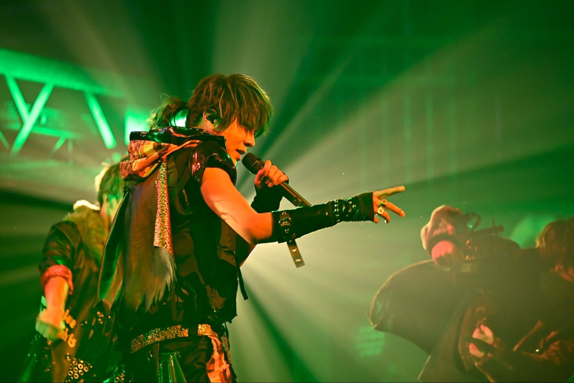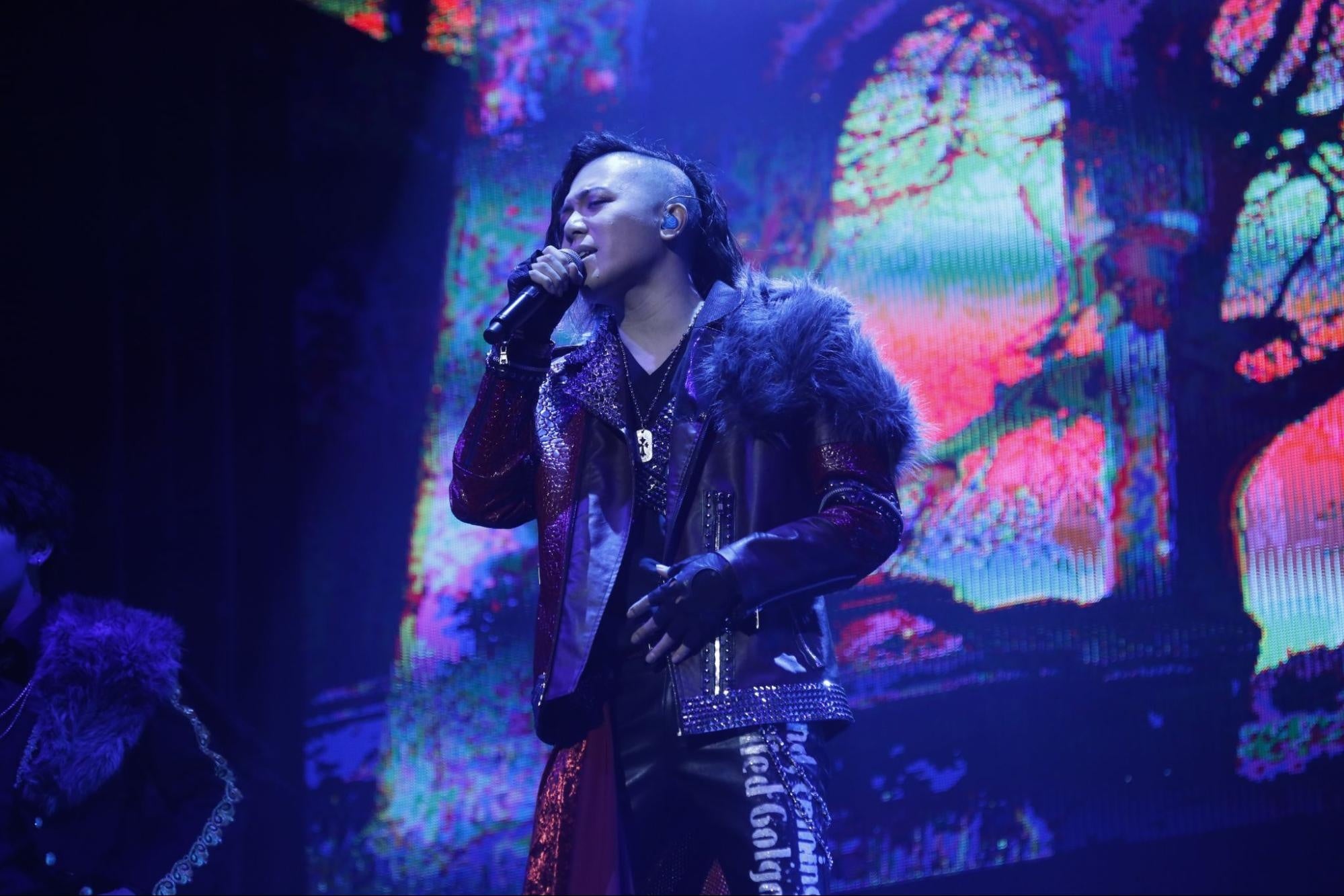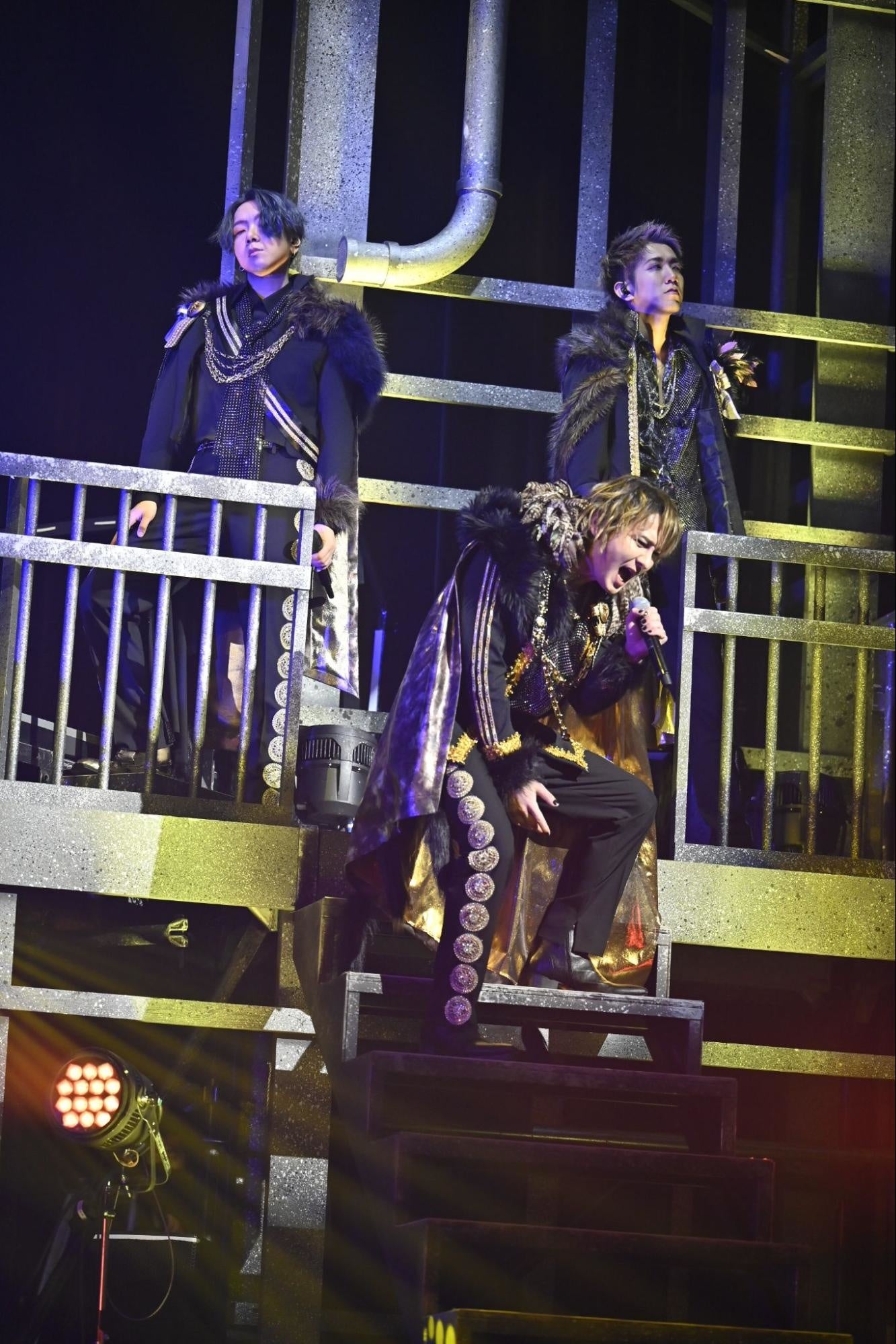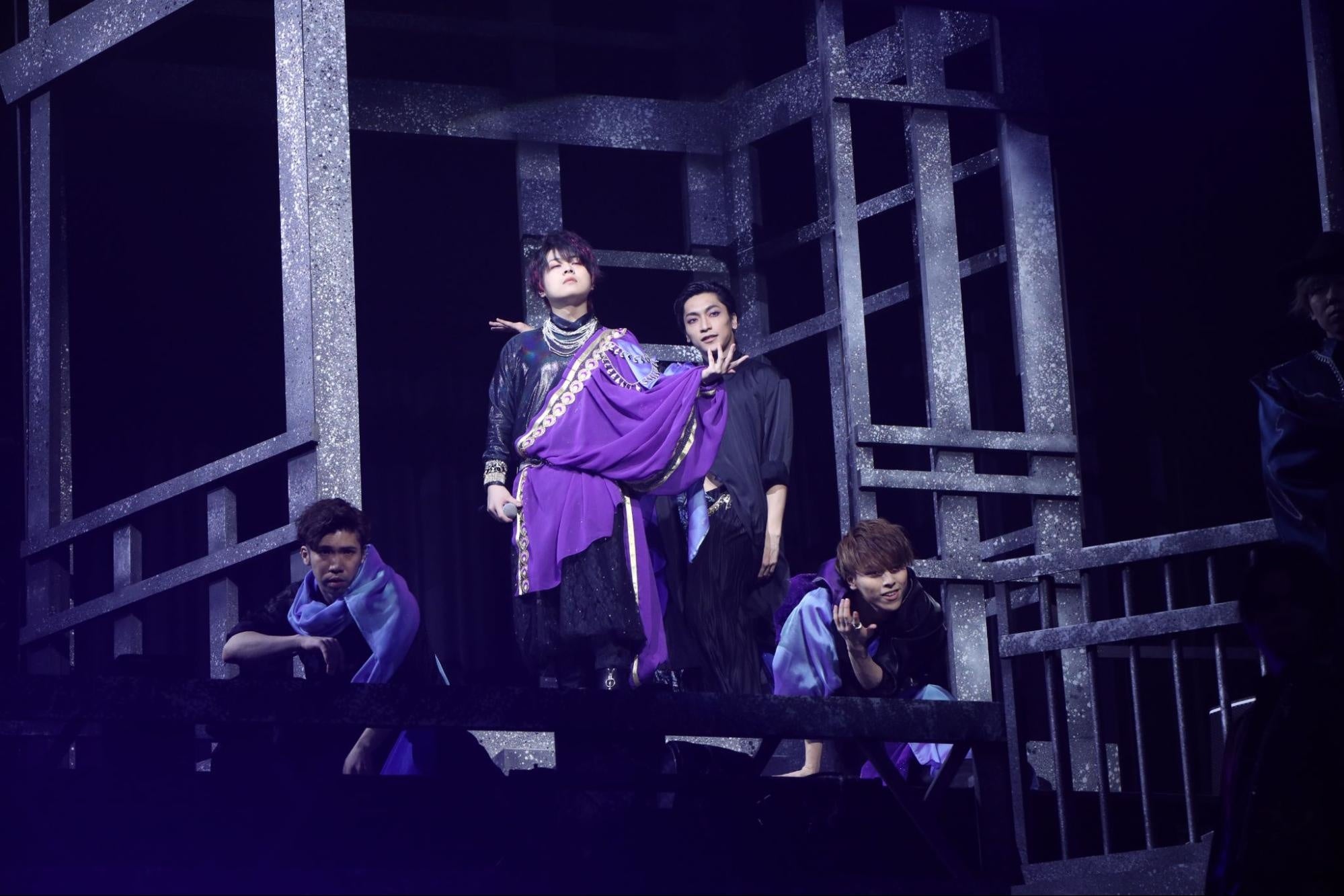 ここでMCは小林とIDE、そしてしゃけみー。年明けから暴れ倒すパフォーマンスをした3人のトークはとにかく和やか。前回のライブから1年を経た今の楽曲への想いを語ると、そのまま小林に渡る歌のバトン。「美女と野獣」を原典に野獣の孤独の想いを歌う「孤独の夜、祈りの月、」をしっとりと歌い上げると会場のオーディエンスはじっと聴き入っていた。舞台上には月が映し出され、月が繋いでいくように続いたのはチームCの「花ほどく」。しゃけみーのハイトーンが色香を漂わせながらフロアを浸食すると、掻き鳴らされるガット弦の音が「Luminous Snow」のイントロを響かせ、あじっこが登場。ここでも月で繋がる一曲だ。「幸福な王子」を原典に生まれたナンバーは琴線に触れるメロディ。軽やかに歌い上げるリンドウが見えて来る。モニターの月に降る雪が止むと、松本と齋藤の「沈まぬ月」へ。光に導かれるように静かに響く松本の歌声にコーラスを添えていく齋藤。ダンサーの理土、服部悠、巽imustatも、指の先までエモーショナルなパフォーマンスで楽曲が描き出す金色夜叉の世界をさらに深く彩っていく。満月が雲に陰り、姿を現した三日月の下に登場したのはIDE。ヒースの想いを紡ぐ「綺羅星」を滔々とZepp Yokohamaへ刻み付けた。夜明けが近づく。月下での渡辺謙典のソロダンスから始まり、PASSION・理土・巽imustatが続き、チームCの華麗なダンスパフォーマンスを印象付けると、しゃけみーの登場と共に「Purple Dawn」を披露。歌とダンスを一体で魅せるチームCの真骨頂を堪能させた。さらにチームCはビゼーの「真珠採り」を原典とした「灰燼に罪」で物語性の高いパフォーマンスを披露し会場の視線を惹きつけ、「暁の願い」では人ならざるものとの恋を歌い舞う。