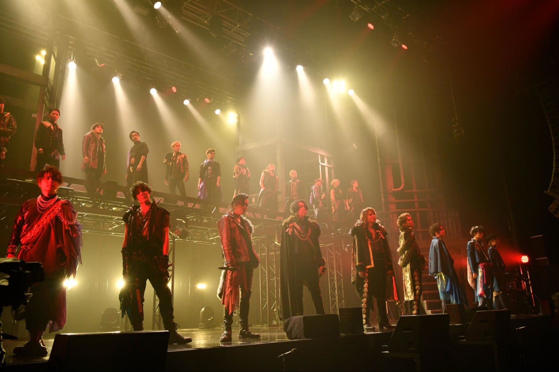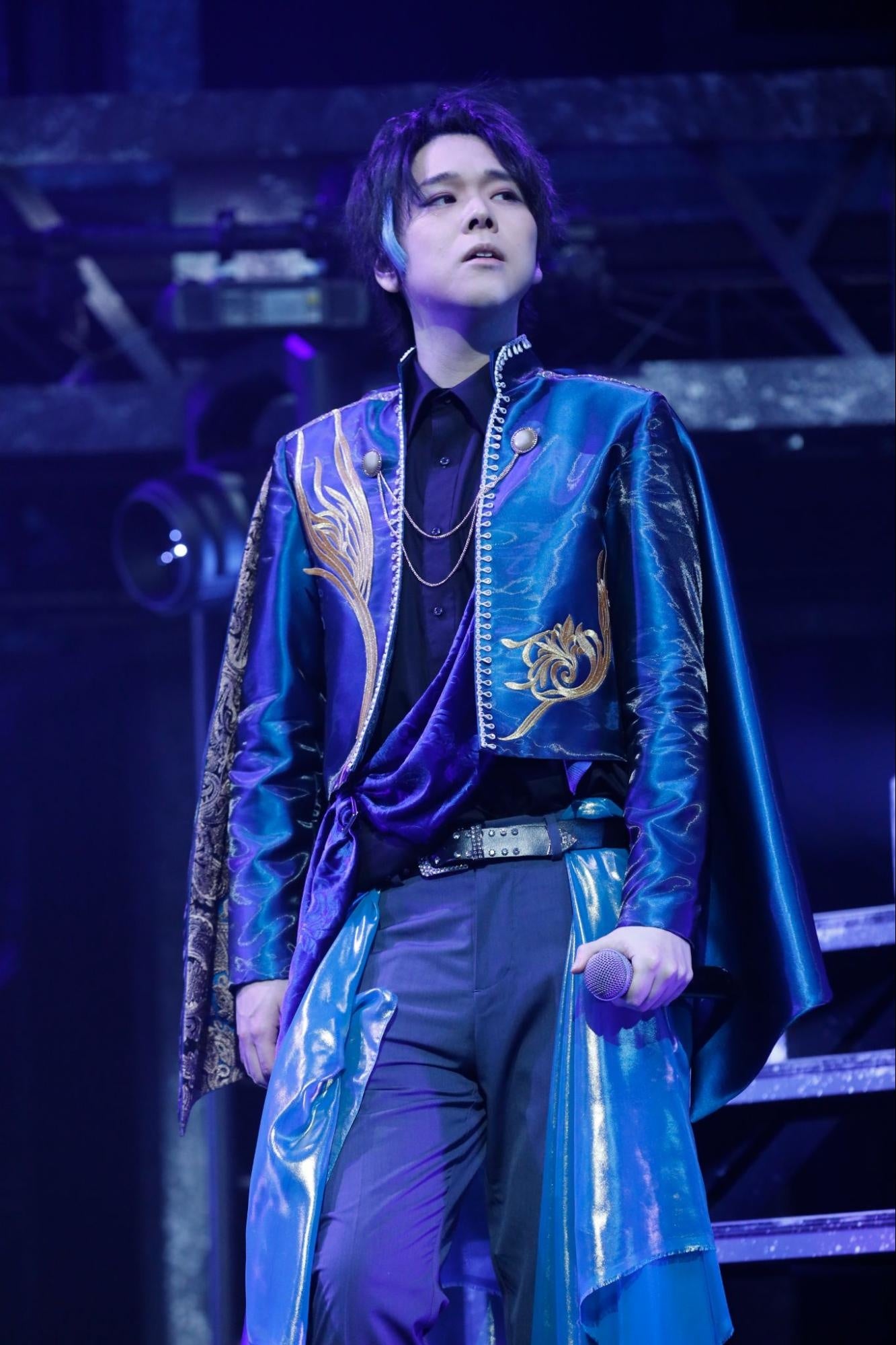 5人の切なくも妖艶なパフォーマンスに続いて登場したのは薔薇を手にした藤田と齋藤。歌のバトンはチームKへと渡り、ビゼーの「カルメン」を原典とした楽曲「花はかすかに」では、カルメンから投げられた薔薇を胸に抱く二人の歌声が響いた。チームKのシンガー3人によるトークパートでは「ここまで22曲歌いました。本当に曲が増えましたね」と藤田。「チームKは3人になっての「MADNESS JOKER」がすごく印象的でした」と齋藤。「本当にドキドキです。普段はギター持って歌っていますから」と松本も感想を口にし、ライブへの感慨を伝えた。ここからチームKが本領を発揮。まずは夜光の「波のままに」。シェイクスピアの喜劇「十二夜」を基にしたこの一曲を、ダンサーを率い自らも踊り、熱を込めて歌い上げると、齋藤も「The Final Problem」を情感たっぷりに響かせ、ここで王者・藤田の登場だ。華やぎ煌めくシアタースターレスのステージを彷彿とさせるような豪奢な「エギーユ・クルーズ」でチームKの時間を締めくくると、重厚なインストと共に舞台が赤い照明で染め上げられる。遠くから「Bad Blood」のフレーズが聴こえてきたかと思うと、Shumei、理土、SHIMa、TORAを率いて小林が現れ、チームWの世界へとステージが変貌する。渾身の「Bad Blood」では声が出せないフロアの観衆も高くサイリウムを挙げ、小林に応える。スターレスの総仕上げ! と圧倒的な歌唱力で席捲する小林は「Seaside Escape」、「Breakin’ it faster」と歌い上げると、「カラマーゾフの兄弟」を原典に長男で野性的な魅力に溢れるドミートリィの視点で描かれた2周年曲「GOLGODA」を聴かせる。ドラマティックな一曲は荒々しいダンスと共に雄々しさを放つ。ここまで約30曲を披露したライブ。そんなライブの本編最後を飾ったのは1周年曲「Just a Loser」。松本を加え、シンガー9人での披露は初めてとなるこのナンバーはパワーを増し、力強く会場を熱くした。全員が歩みながらクロスしていくステージ上でのパフォーマンスは鳥肌が立つような感覚を呼び起こし、同じく交差していくボーカルの響きも含め、圧巻のステージングだった。