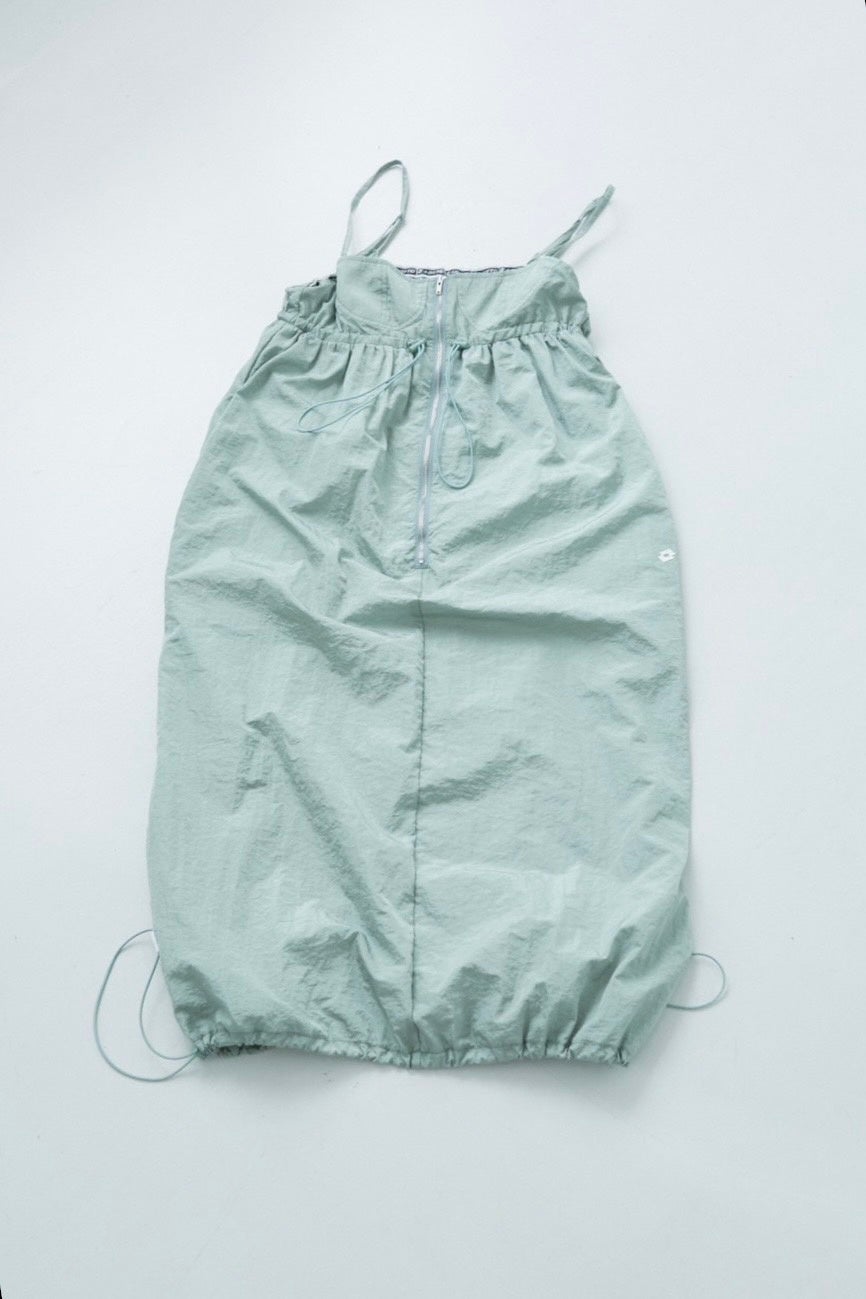 カップディテールと裾ドロストを施したバルーンシルエットのキャミワンピース。