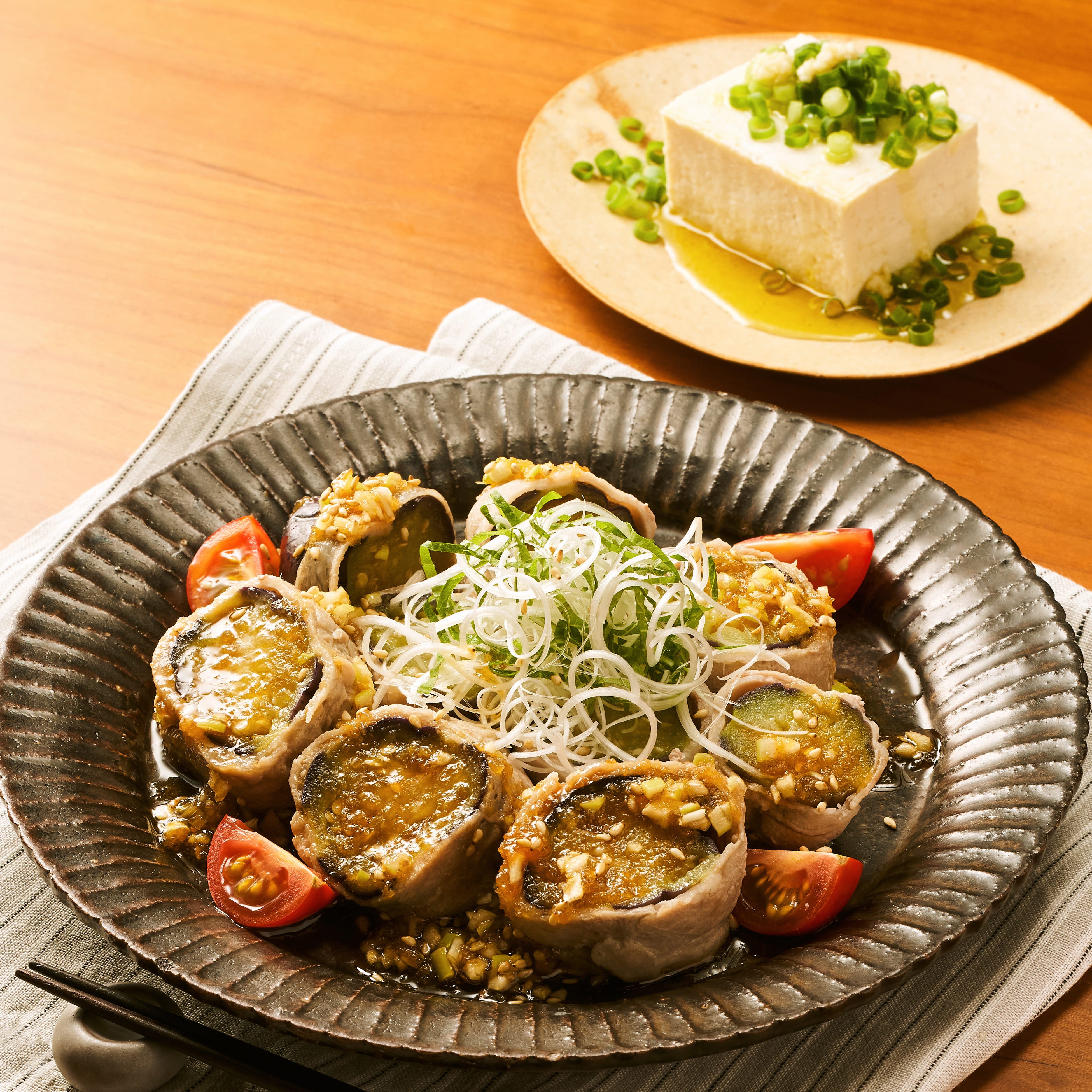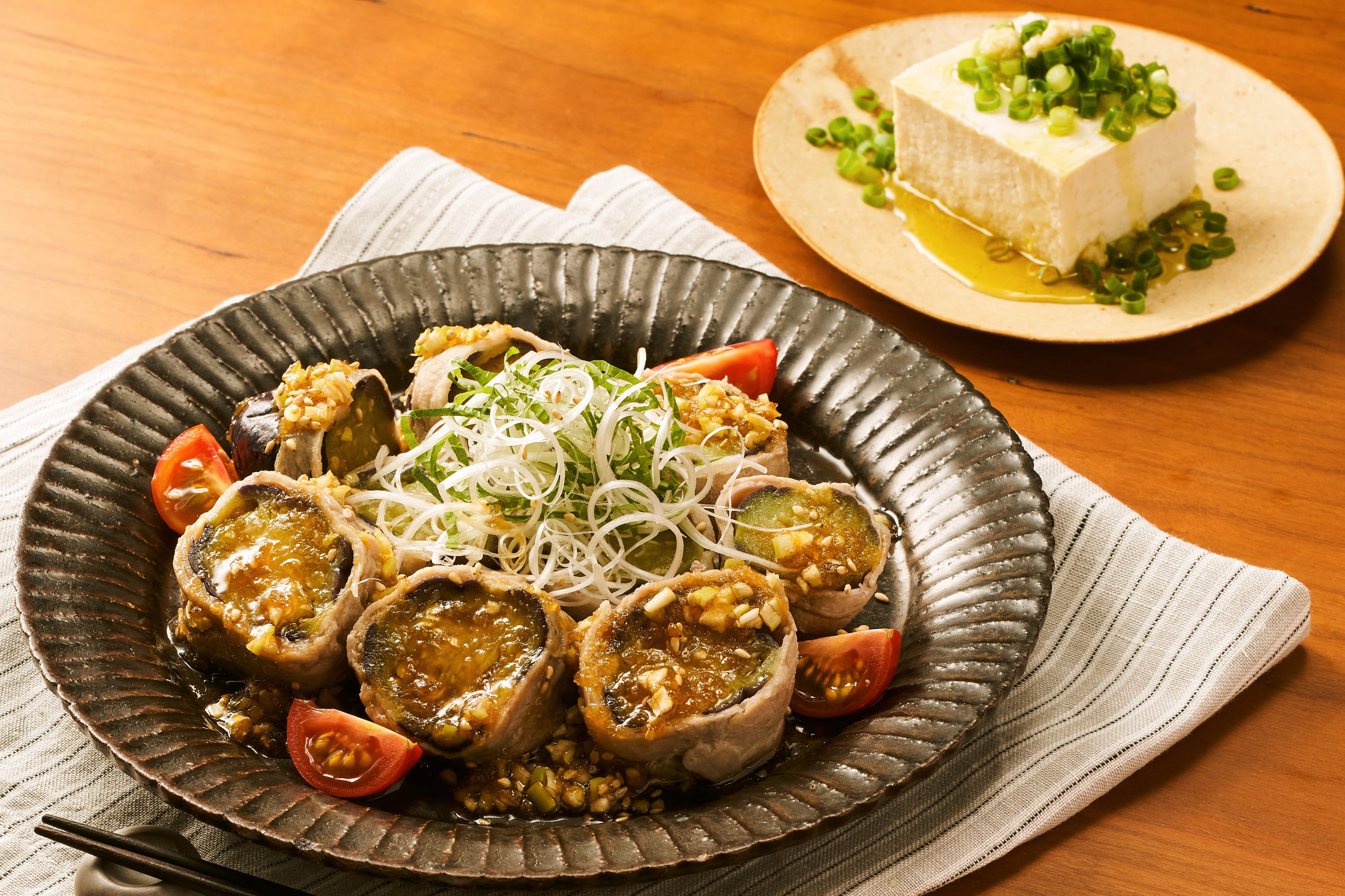 レンジで作るなすの肉巻きは、豚肉はしっとり、なすはふわふわに仕上がります。薬味たっぷりのさっぱりとしたたれを回しかけてお召し上がりください。わさびオイルと塩でたべるねぎやっこと合わせて、香り豊かなおかずが完成します。