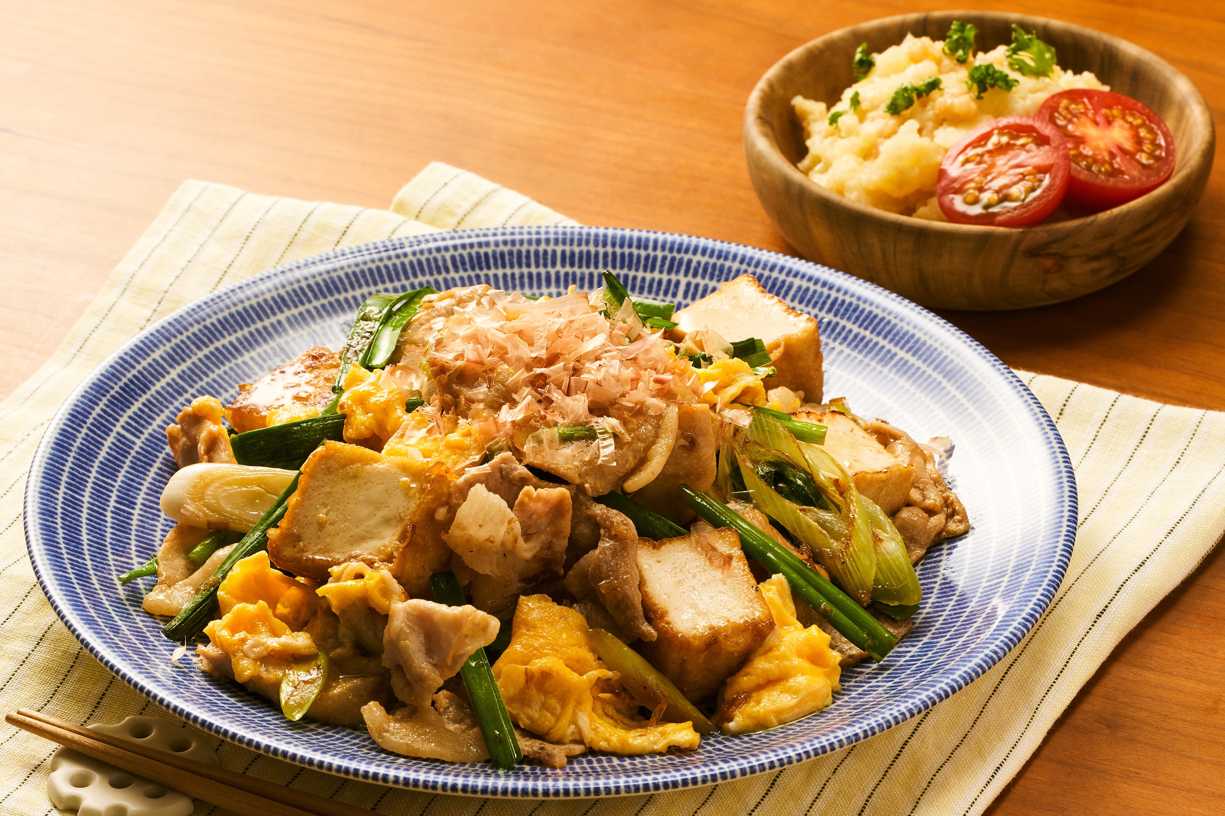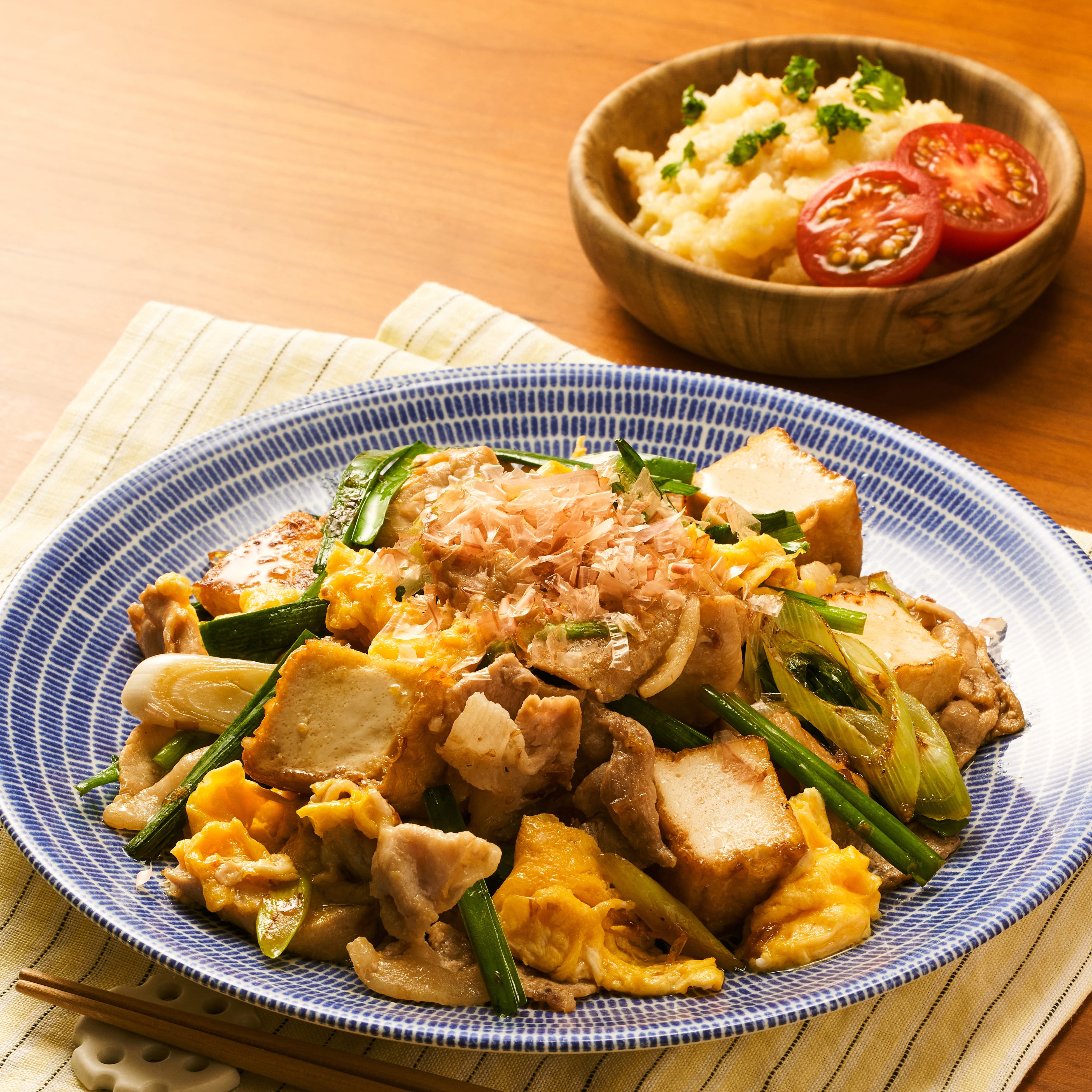 ふんわり卵を作ったら、そのあとは手順よく食材を炒めて完成!仕上げにかつお節を加えて、だしを入れなくても深みのある味わいに仕上げました。杏さん家で人気のタラモサラダを添えて、ご家族で楽しめる優しい味わいのセットです。