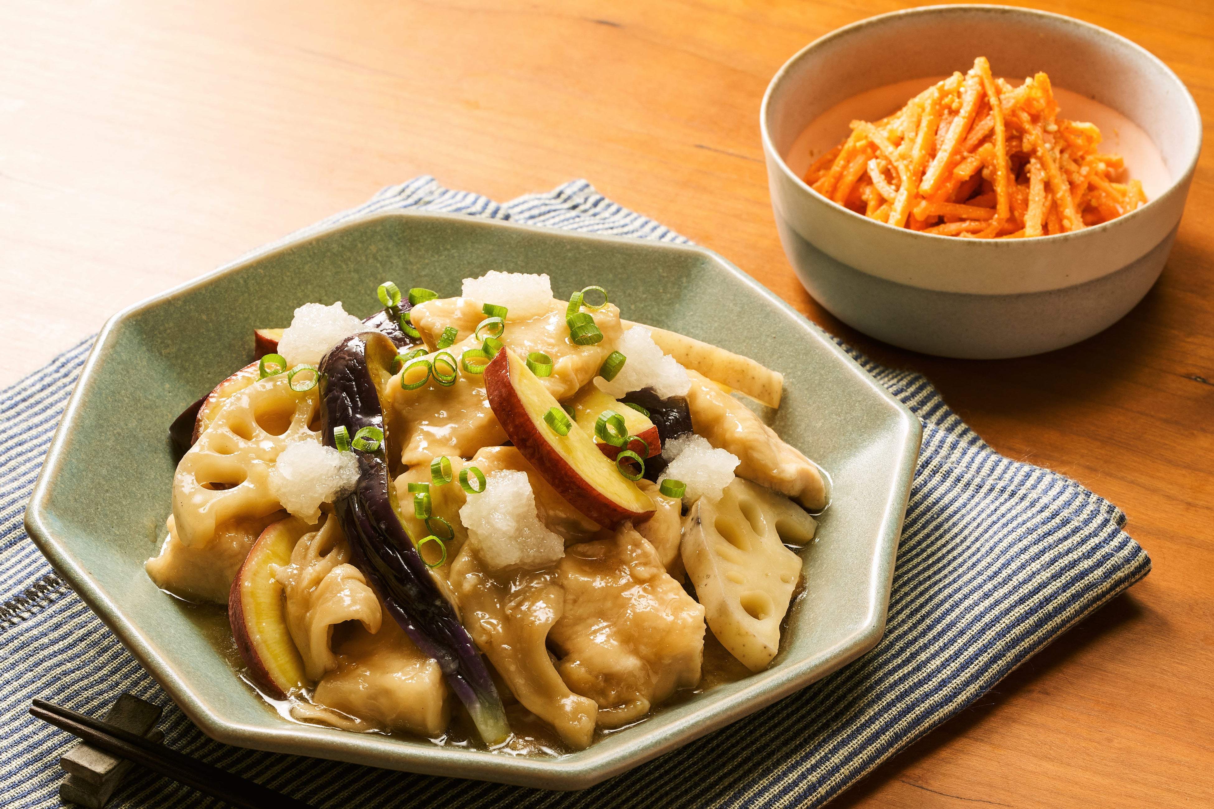 小分けの大根おろしで、みぞれ煮の手間を軽減しました。鶏肉はそぎ切りと粉うちで、味染みとつるっとした食感を両立。小さな工夫で上品な仕上がりになるおかずです。副菜はごまをたっぷりと入れた、素材を味わうシンプルサラダです。