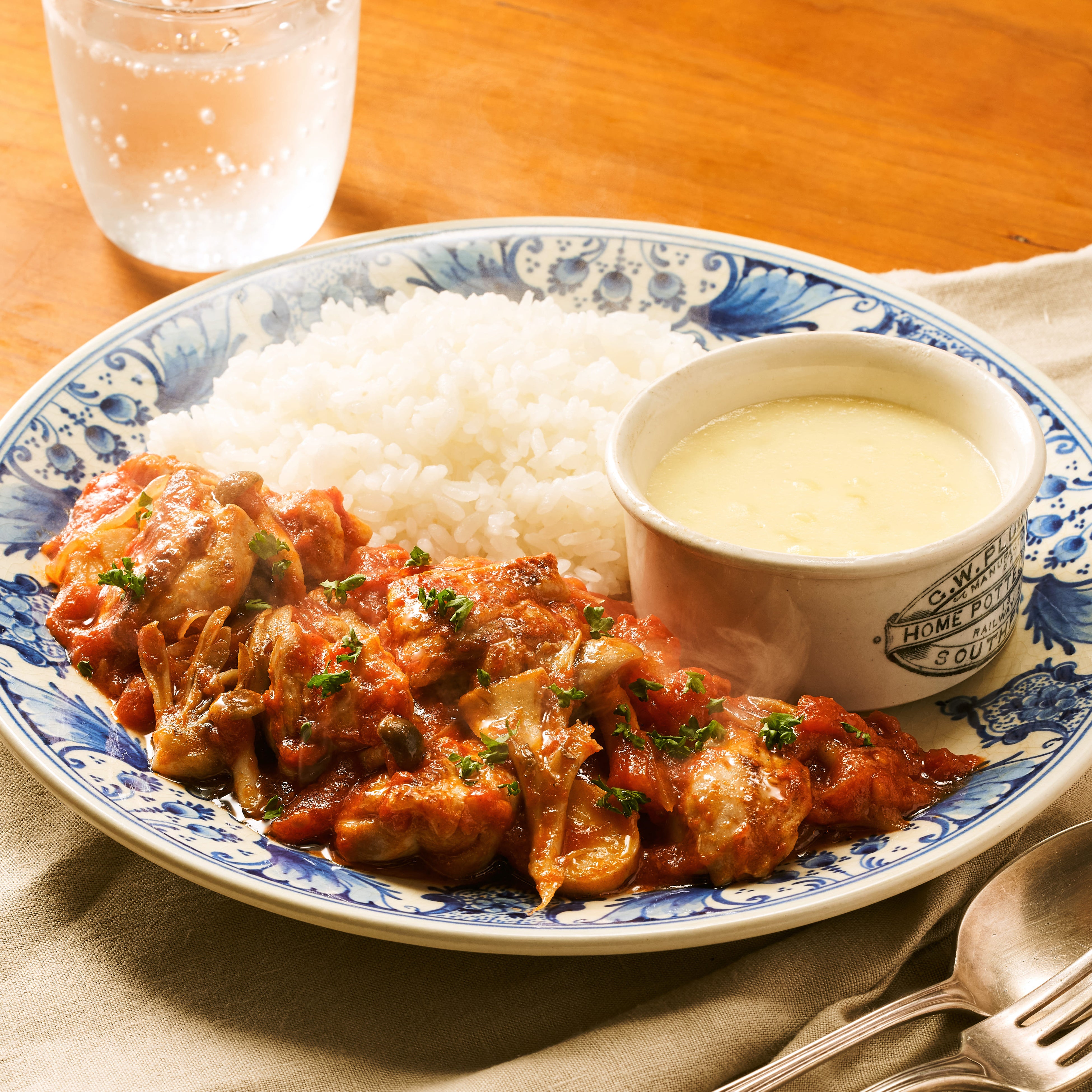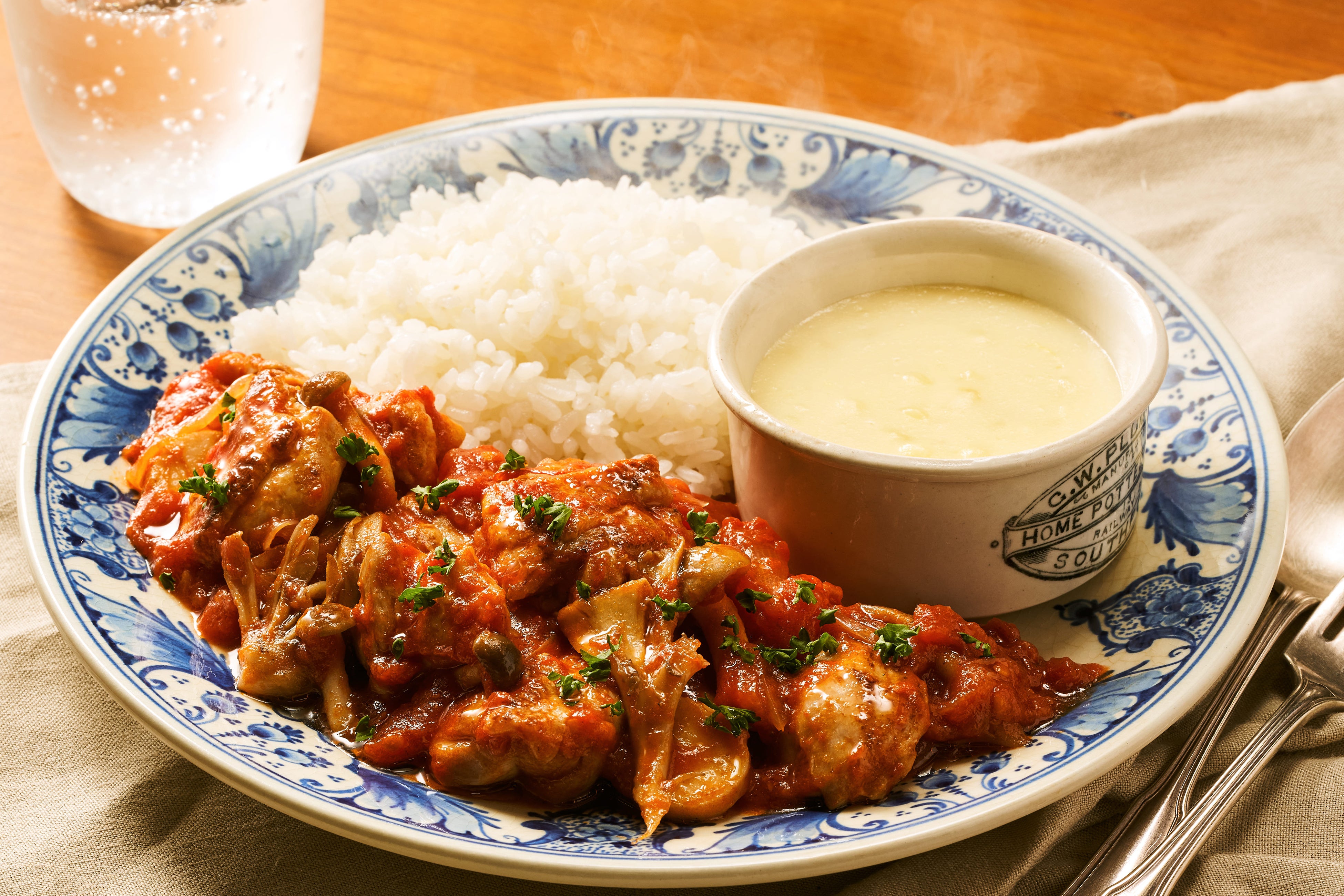こんがりと焼き目をつけた鶏肉と、3種のきのこをさっと煮込んだトマト煮込み。杏さんがフランスで暮らしはじめてからよく作るようになった、じゃがいもにチーズを加えて作るアリゴを添えました。トマト煮込みとアリゴをからめながらお召し上がりください。