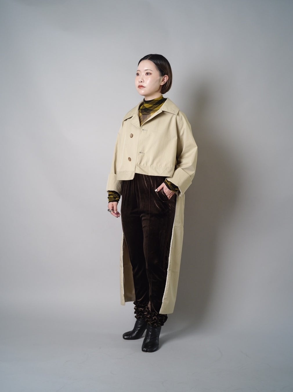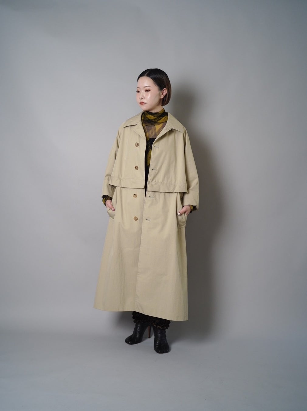 人が立った状態、座った状態どちらでも7通りの着こなし方が楽しめるコートです。