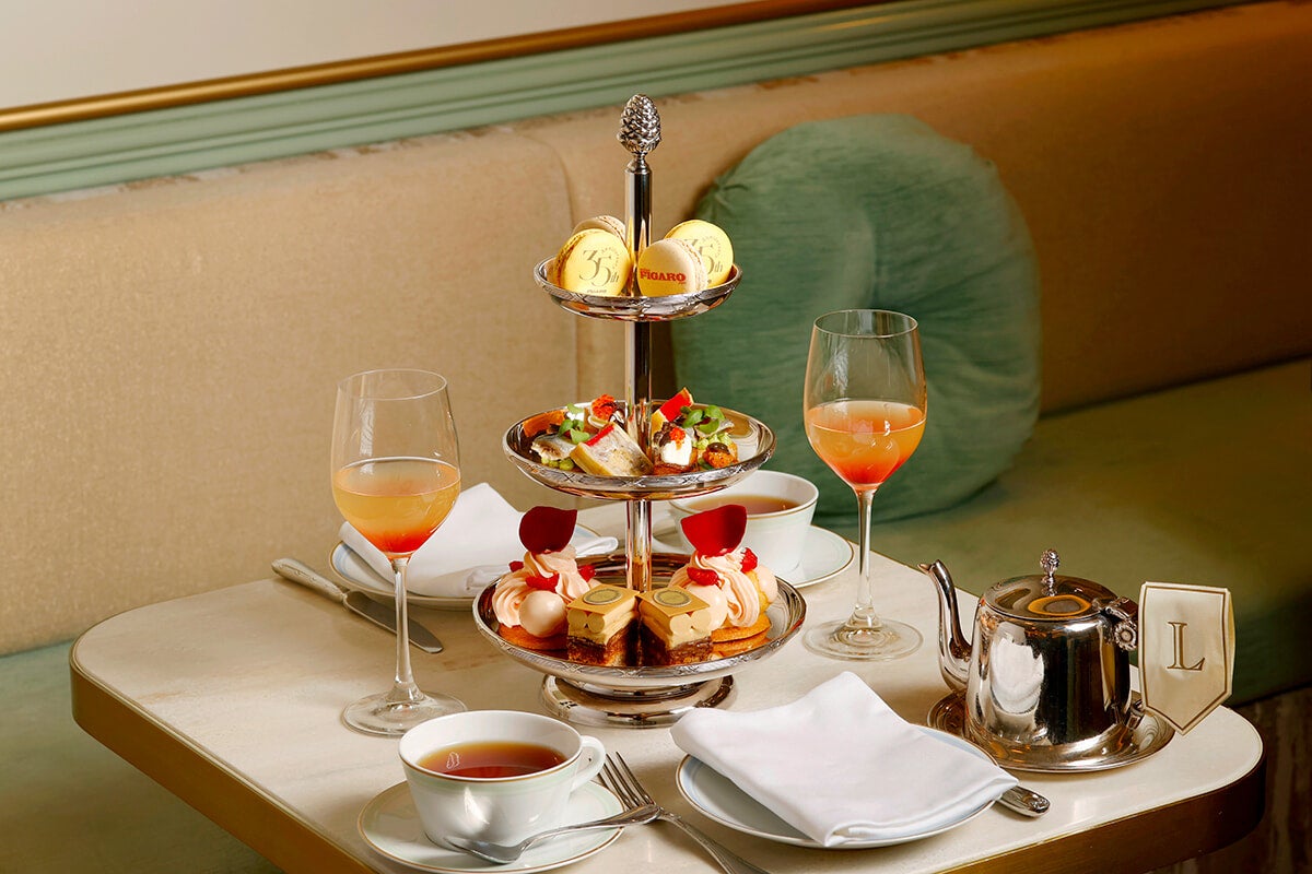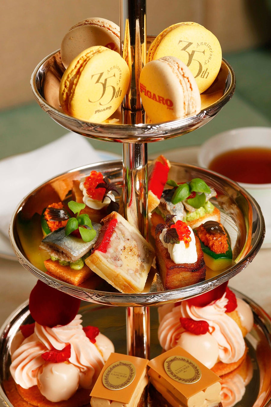ラデュレ 日比谷店でのアフタヌーンティーは「フランスへの旅」がテーマ。アールドゥヴィーヴルを感じるミニサイズのパティスリー、フランス東西南北の郷土料理にインスパイアされたセイボリー、スタンドの一番上にはフィガロジャポンと35周年記念のロゴがそれぞれ入ったプリントマカロンも! 飲み物にはラデュレオリジナルのウェルカムドリンクと、コーヒーまたは紅茶がつく。紅茶は人気のマリー・アントワネットやメランジェ・ラデュレをはじめ、クラシック、ベリー、柑橘、花、スパイシー&スモーキー、パティスリーアロマなど10種類以上から好みのティーを選べるのがうれしい。