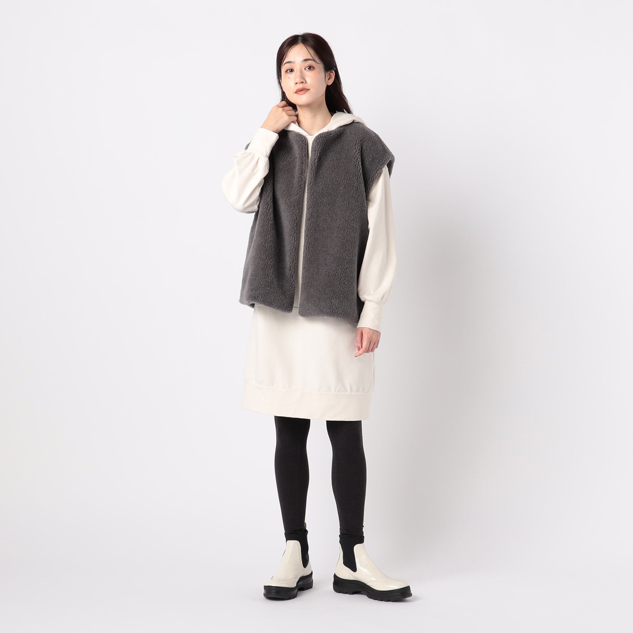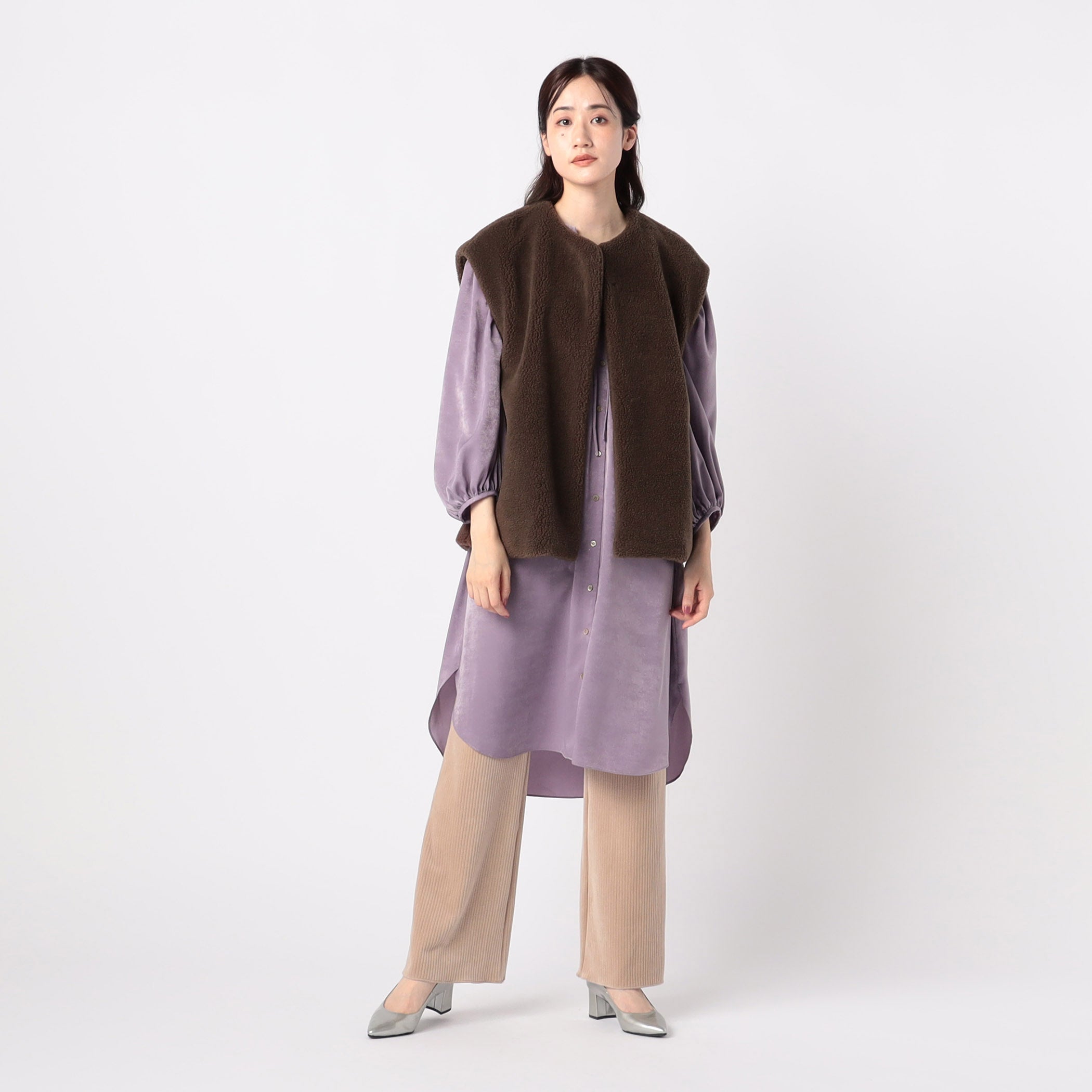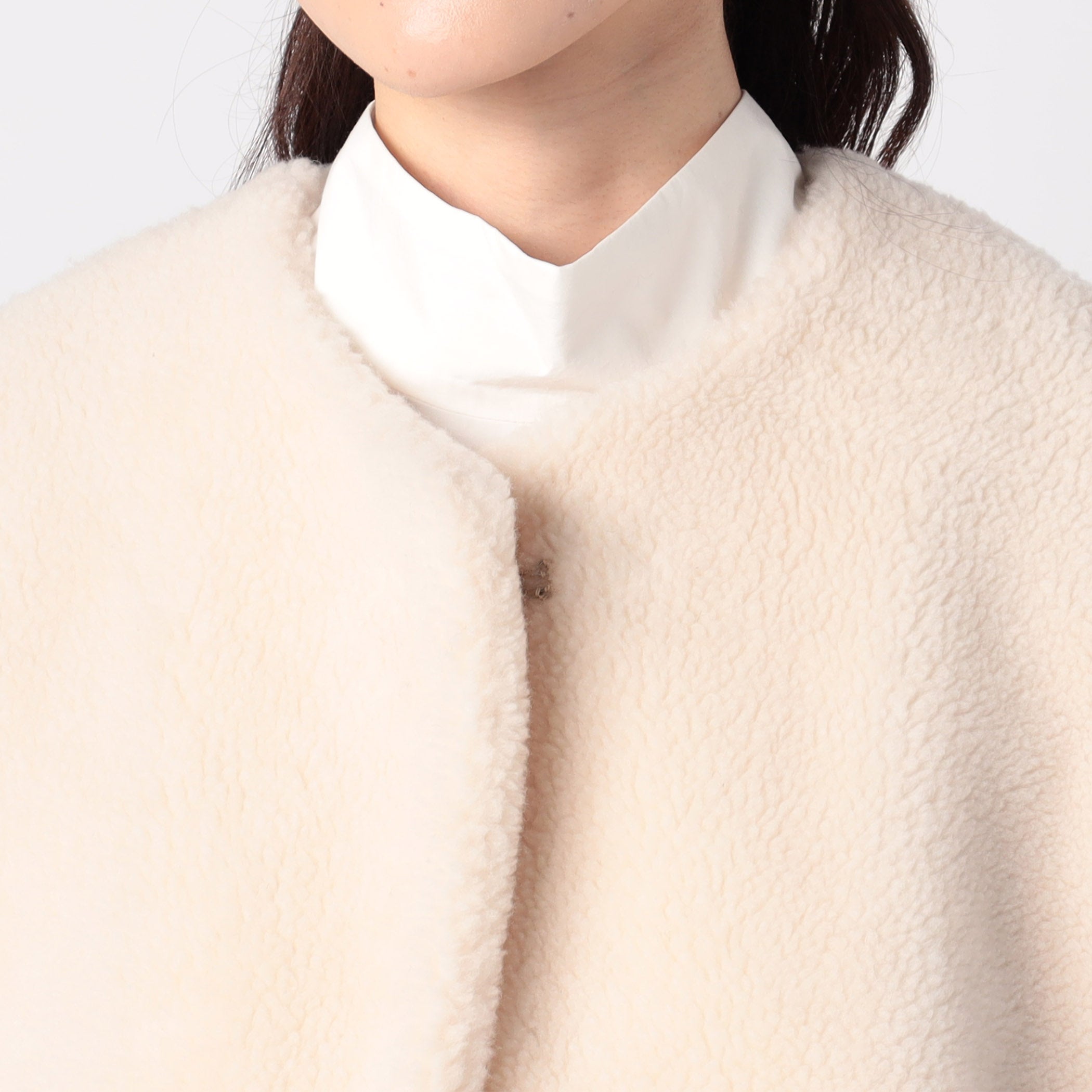 羽織るだけでコーディネートのアクセントになり、一着でぐっと秋の装いになる便利なアイテムをつくりたいと考え、毛足がぎっしり詰まりボリュームのあるエコ素材のボアで、スリーブレスブルゾンをつくりました。