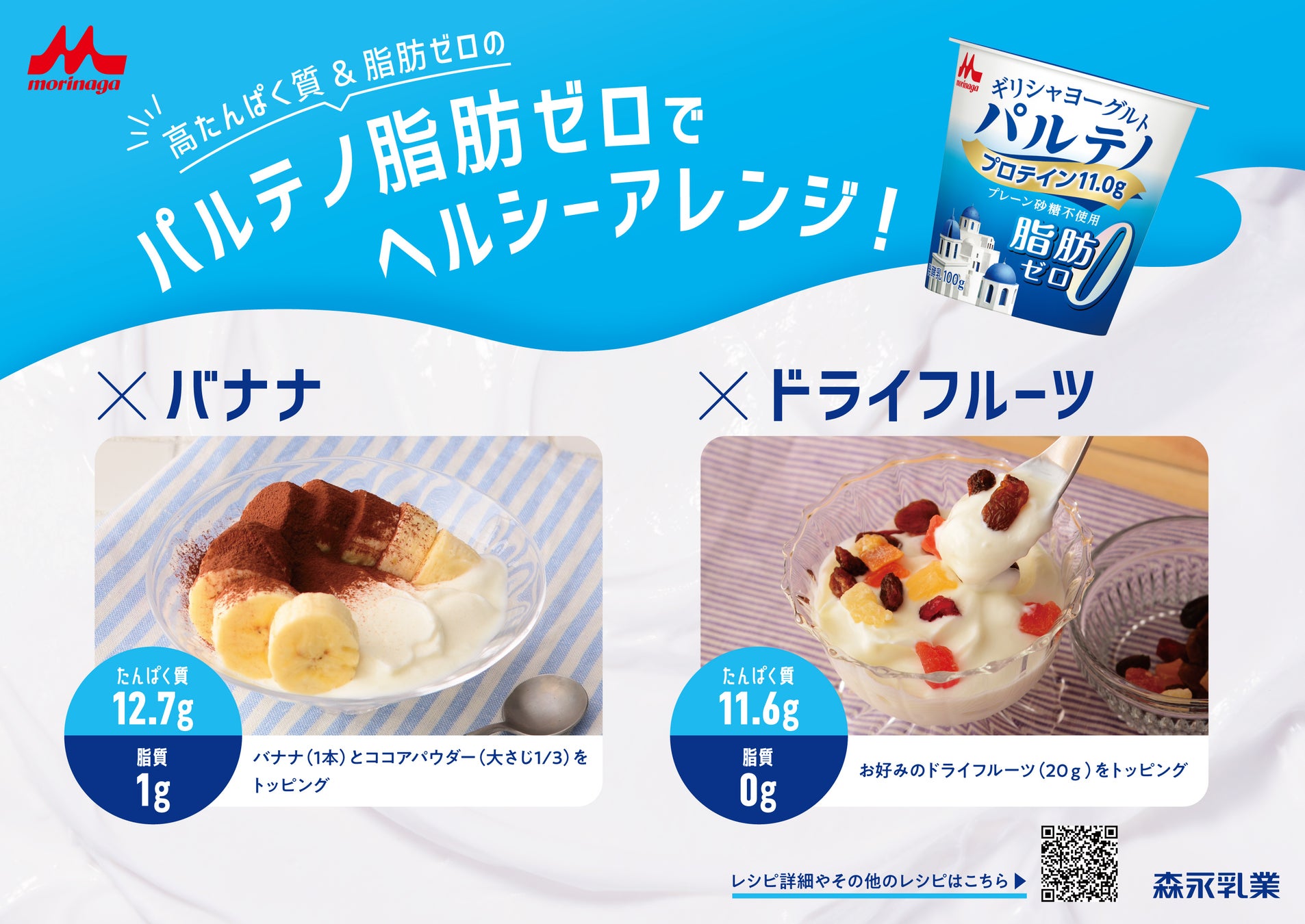 商品の発売にあわせて「ギリシャヨーグルト パルテノ 脂肪ゼロ プレーン砂糖不使用」を使ったヘルシーアレンジレシピを、森永乳業の公式レシピサイト(https://www.morinagamilk.co.jp/recipe/result.php?pi=8301)にてご紹介します。(2023 年 4 月 18 日時点では 4 レシピ掲載予定)