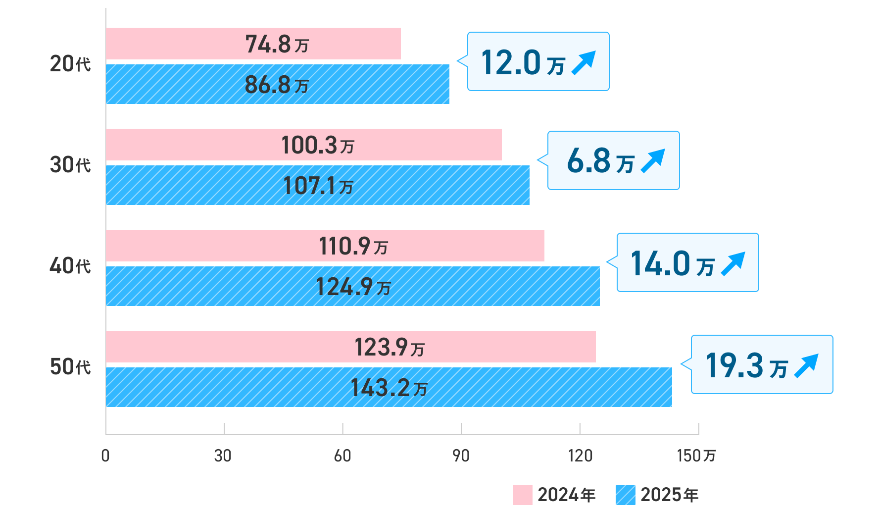 前回からの変化が大きかったのは、50代の19.3万円アップ、次いで40代の14.0万円アップ