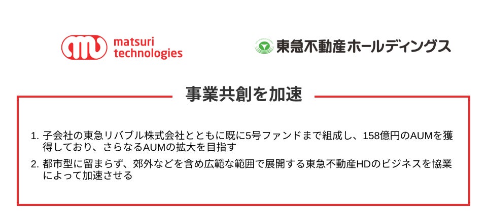 すでに東急不動産HDの子会社東急リバブル株式会社とは、私たちの提供するソフトウェアを主軸に、空間の価値を最大化するソリューション「StayX」にてすでに5本のファンドを共創しており、今回の資本参画を含めさらに連携を加速する予定です。