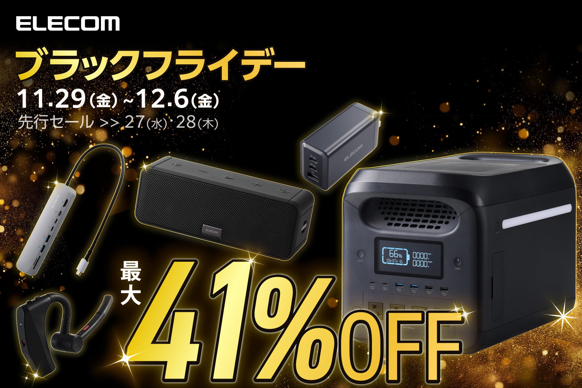 エレコム株式会社(本社:大阪市中央区、取締役社長執行役員:石見 浩一)は、Amazonで2024年11月29日(金)0:00から12月6日(金)23:59に開催される「Amazon ブラックフライデー」において、エレコムのポータブル電源やテスコムのヘアドライヤーなど人気製品を最大41%OFFの特別価格でご案内いたします。