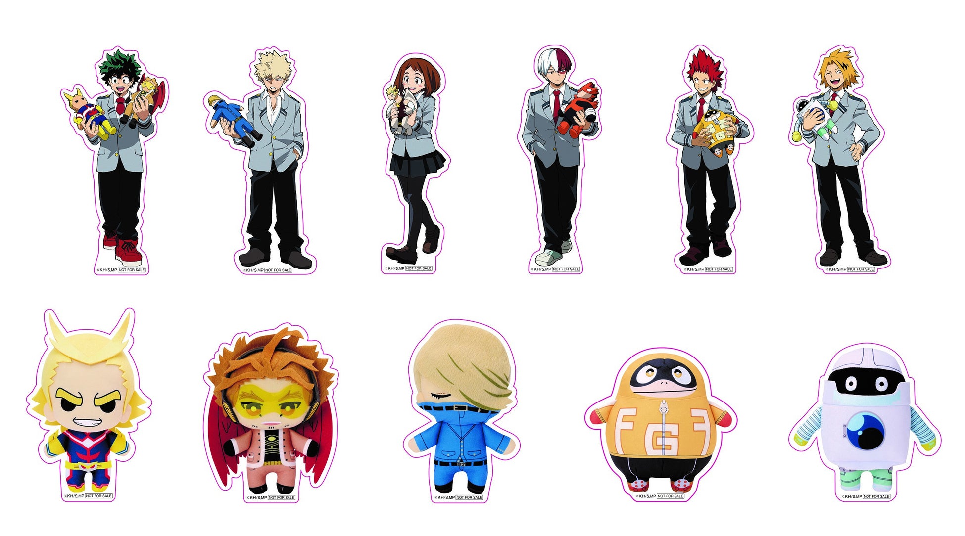 キャンペーン期間中、ナムコ限定描き下ろしビジュアルを使用した「缶バッジ」や「アクリルプレート」、プロヒーローたちの「ぎゅっともぬい」と「ともぬい」、「巾着」が限定景品として登場します。