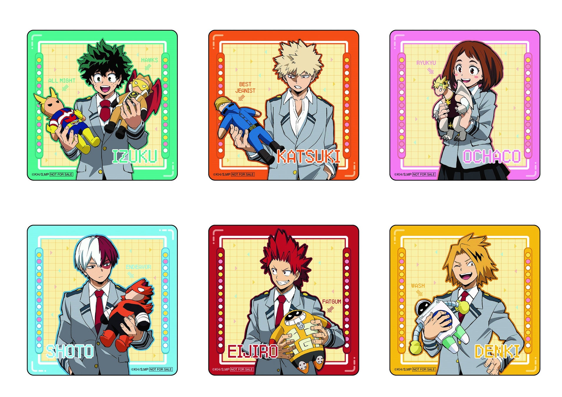| (4)僕のヒーローアカデミア スタンド付きアクリルプレート~ナムコキャンペーン~(全6種) 3月17日(金)登場予定 サイズ:約15cm ・緑谷出久(みどりやいずく) ・爆豪勝己(ばくごうかつき) ・麗日お茶子(うららかおちゃこ) ・轟焦凍(とどろきしょうと) ・切島鋭児郎(きりしまえいじろう) ・上鳴電気(かみなりでんき) ナムコ限定描き下ろしビジュアルを使用したアクリルプレートです。 |