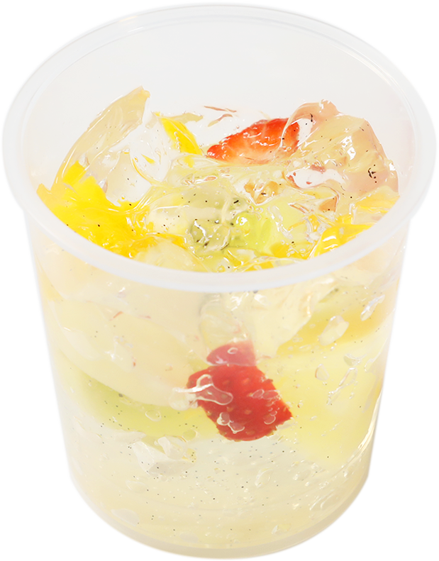 こだわり:爽やかなライムがほのかに香るなめらかな⾷感 のゼリーに、5種類のフルーツ(イチゴ・黄 桃・キウイ・パイン・洋なし)を合わせたス イーツです。