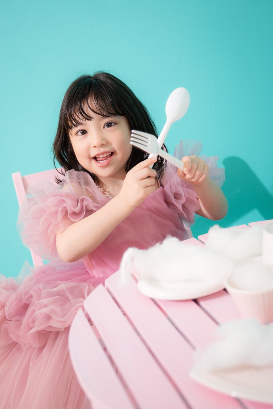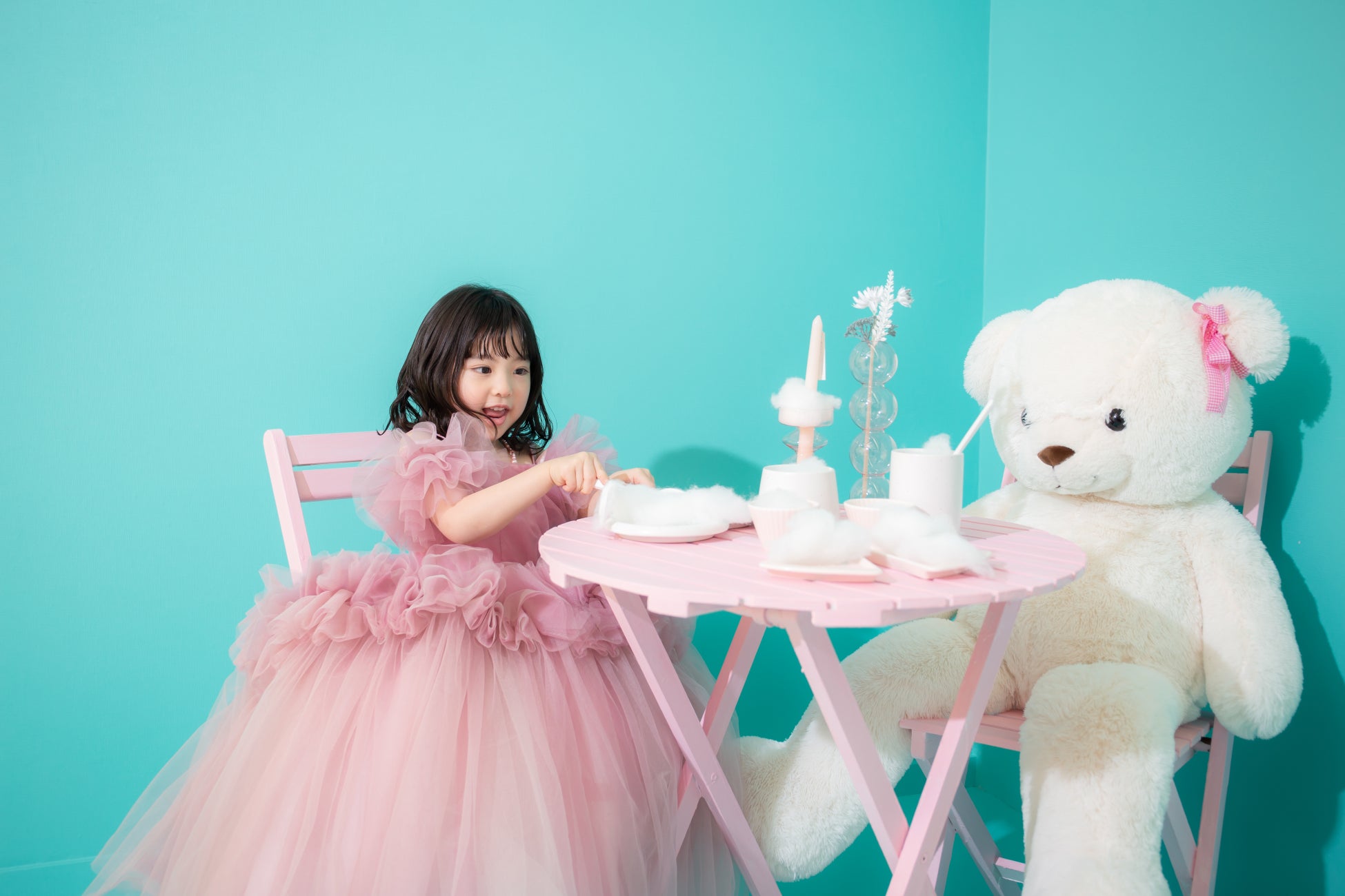 ティーパーティーのテーマを基にふんわりとした女の子の憧れドレスをセレクト。上品さ&スタジオセットのポップさのマッチングが絶妙です。
