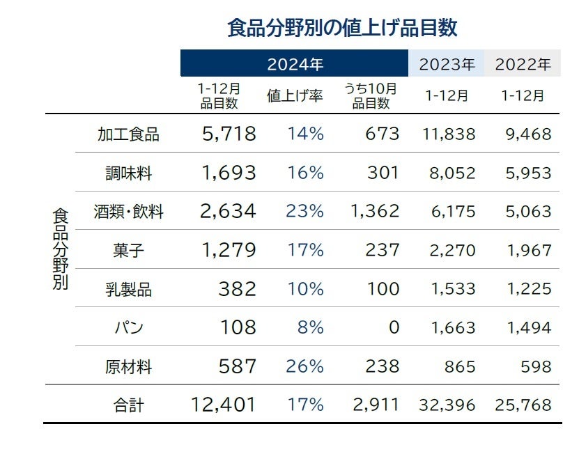 2024年通年の値上げ品目数(予定含む)は12月までの累計で1万2401品目となり、年間の平均値上げ率は17%となった。コメ価格の高騰を要因としたパック米飯製品でまとまった値上げが予定され、11月は11カ月ぶりに前年同月を上回るものの、年末にかけて値上げは沈静化するとみられる。