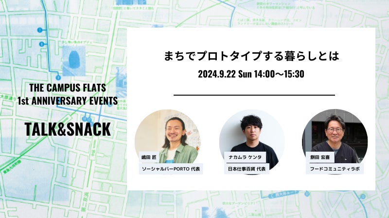 トークイベントでは、過去にFLATSでのSNACK営業に協力いただいたソーシャルバー・PORTO(ポルト)の嶋田 匠氏、いろいろな生き方・働き方を届けている日本仕事百貨のナカムラケンタ氏をゲストとして迎え、THE CAMPUS FLATS TOGOSHIでのプロトタイプを活かして現在活動中の元入居者とともに、これまでの取り組みや街との関わりについて語り合います。地域や街で暮らしながら、自身のやりたいこと・チャレンジの実践(プロトタイプ)のヒントが学べるトークイベントです。