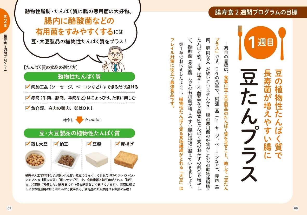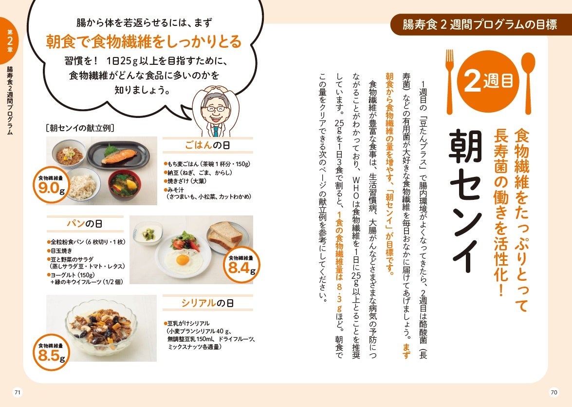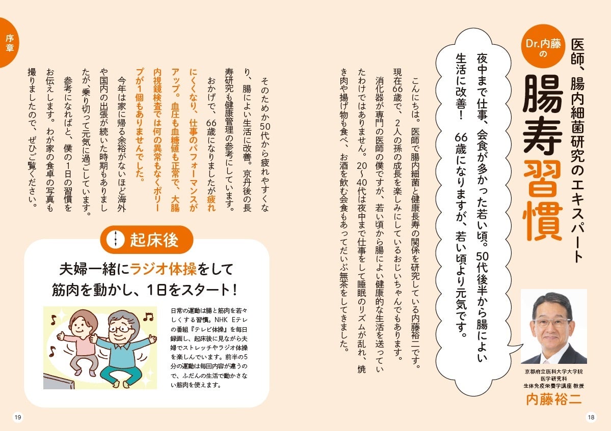 これらの正しいとり方、食べ方のポイントを「腸寿食10の心得」として紹介しています。さらに著者である内藤先生の腸寿習慣として、内藤家の1日の食生活も掲載。無理なくとり入れている実例がとてもためになります。