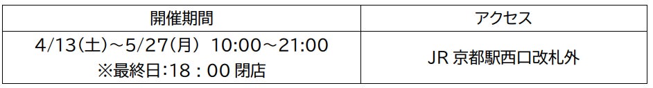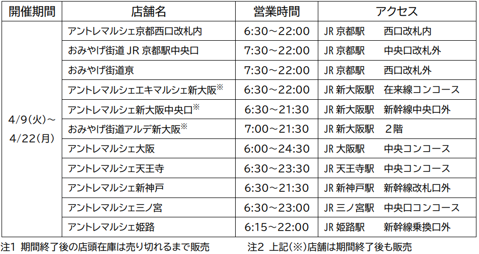 開催場所は500日前にご好評いただいた「エキマル ア・ラ・モードJR大阪駅中央口店」、「JR西日本 京阪神エリアの駅ナカ土産店舗」のほか、「JR京都駅西口改札前 イベントスペース」も加え、販売場所・取扱い商品を拡大します。