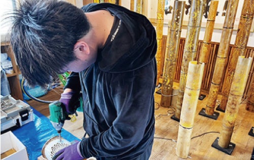 本展示は、里山保全の観点から和歌山県内の放置竹林から伐採した竹を活用し竹あかりを制作されている、株式会社竹千代様(以下、竹千代)のご協力のもと実現しました。さらに今回の作品の中には、竹千代が運営する「キミト☆ミライ白浜」と「キミト☆ミライ海南」(就労継続支援B型事業所)の利用者の方々が、県内竹林で伐採した竹を手作業で丁寧に「竹あかり」へと仕立て、ひとつひとつに想いを込めた作品も一部展示しております。
