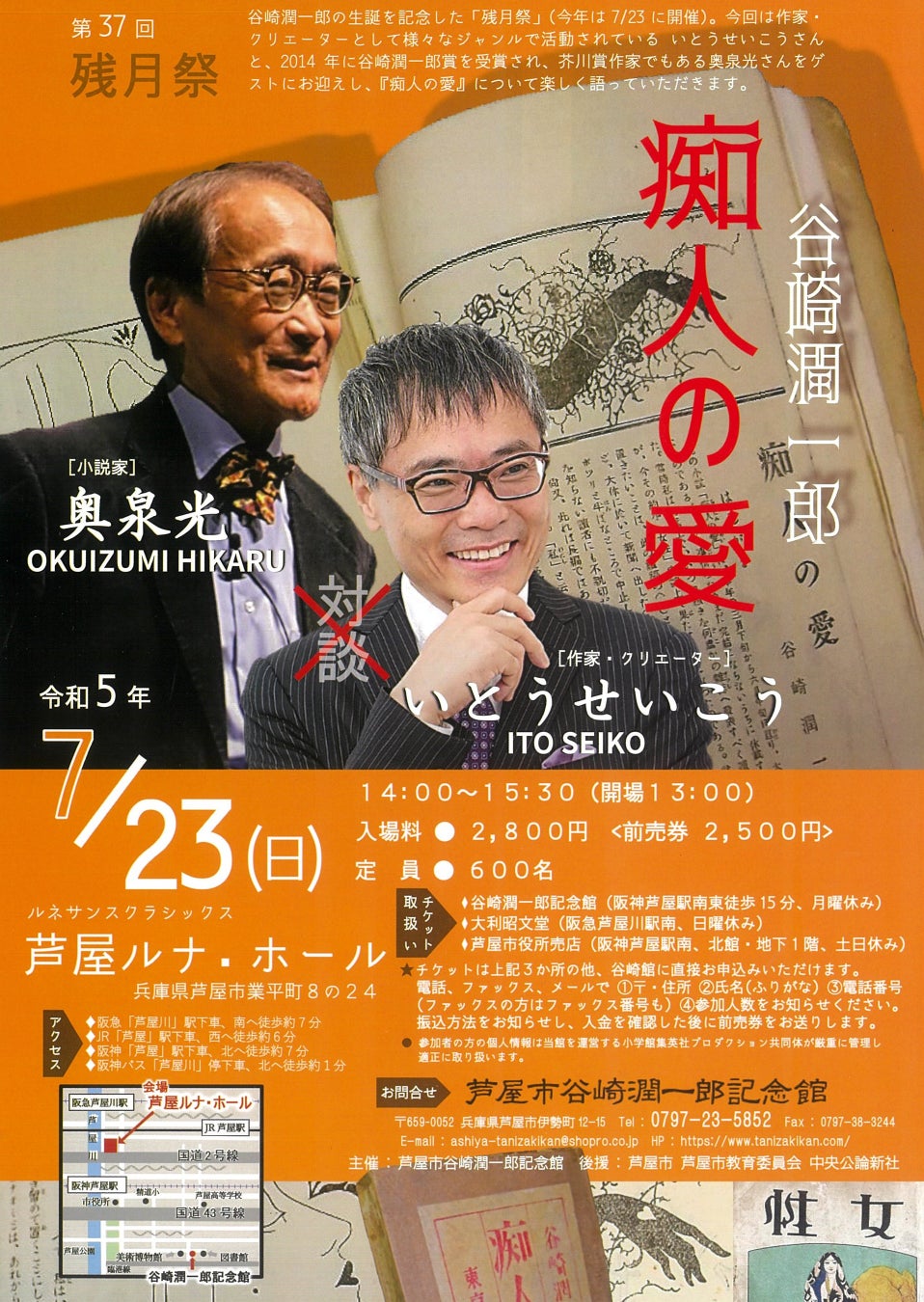 谷崎潤一郎(1886~1965年)の生誕を記念した「残月祭」。37回目を迎える今年は、谷崎の誕生日の前日7月23日(日)に、作家・クリエーターとして様々なジャンルで活動されているいとうせいこうさんと、2014年に谷崎潤一郎賞を受賞され、芥川賞作家でもある奥泉光さんをゲストに迎えます。