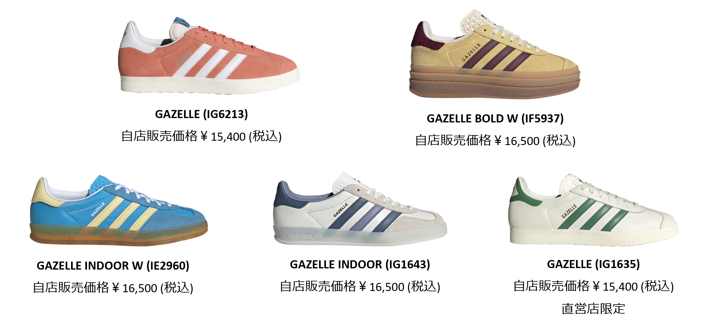 80年代のカナダ製モデルからインスピレーションを得たGAZELLEや、シグネチャーであるスエードアッパーを大胆にもレザーアッパーで刷新したモデルなど、クラシックスタイルを継承しつつもフレッシュな装いのバリエーションが揃います。また、ユニークなカラーリングを配した、クリアガムソールが特徴のGAZELLE INDOOR、クラシックなアッパーに3層構造の厚底ソールを兼ね備えたGAZELLE BOLD Wなどバリエーション豊かなラインナップで展開します。