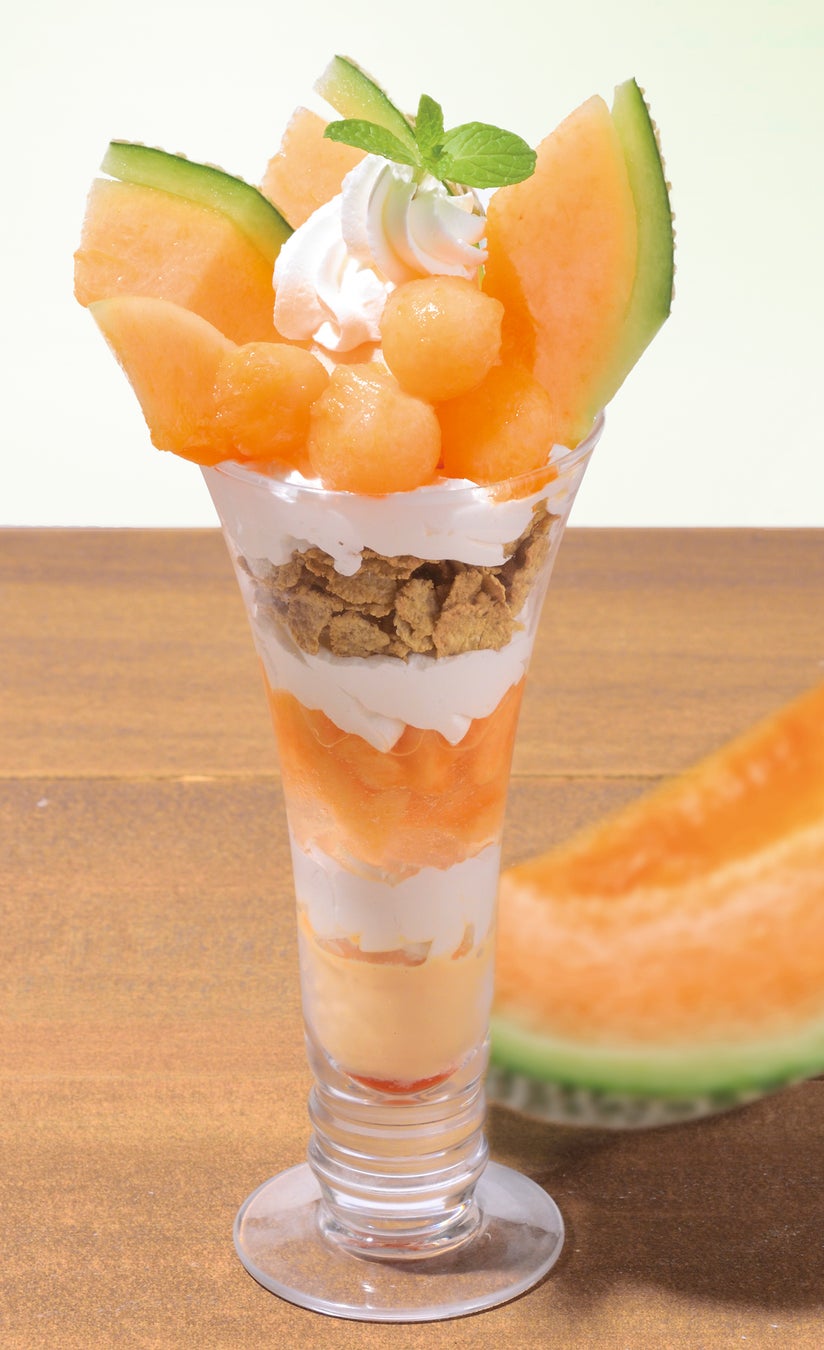 数量限定。気品あふれる芳醇とコク深い味わいの「赤肉メロン」をたっぷり使いました。メロンのみずみずしい果肉に、バニラアイスやクリームの乳味、自家製メロングラニテ(※)が絶妙に調和します。