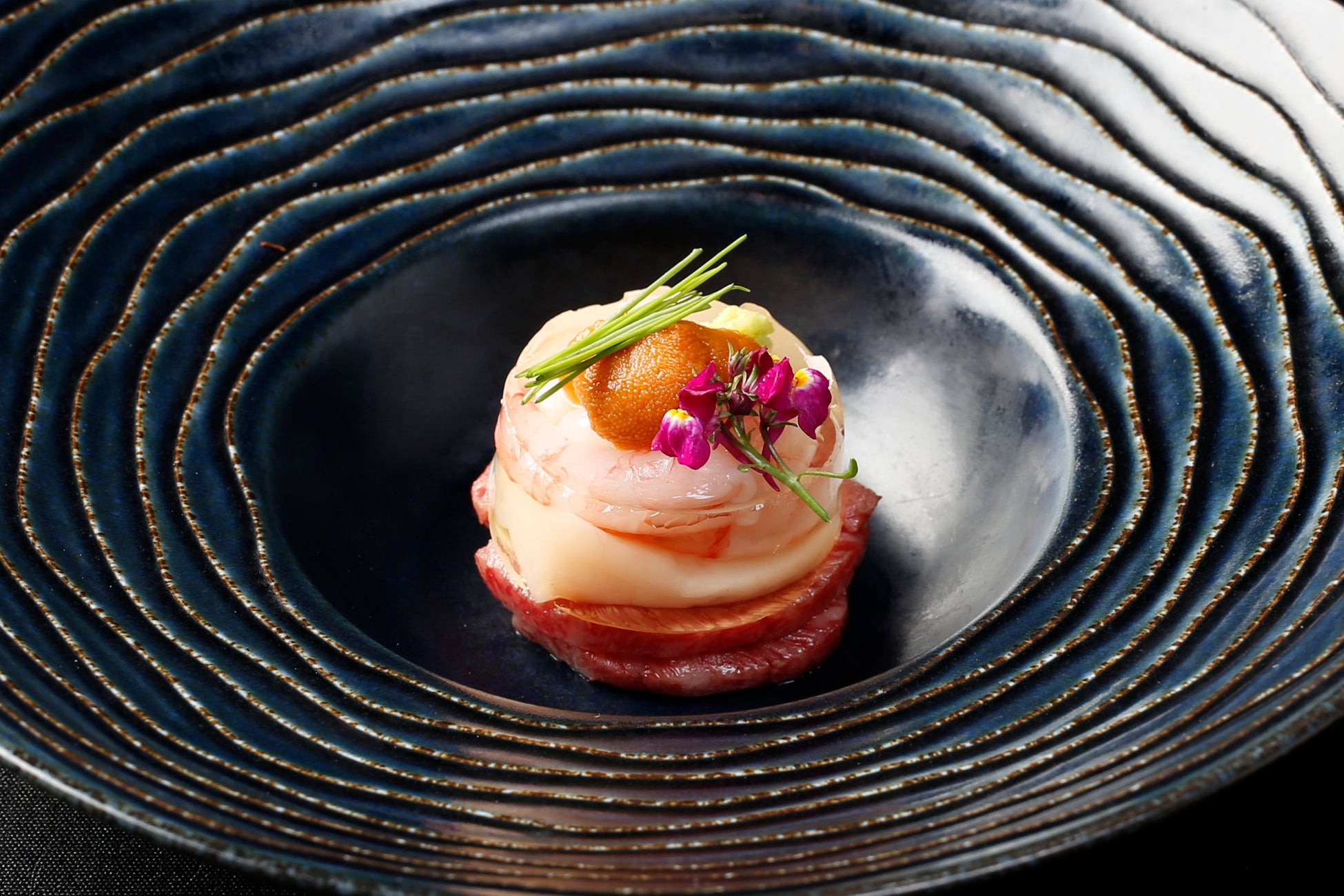 和牛のユッケに甘海老や帆立などの海の幸を重ね、濃厚な雲丹と自家製ジュレで包み込んだ贅沢なひと品。とろけるような和牛の旨みと、海鮮の甘み・磯の香りが一体となり、口に入れた瞬間、奥行きのある味わいが広がります。ジュレが全体をやさしくまとめあげすっきりと引き締めてくれる、まさに"和牛と海鮮のマリアージュ"。