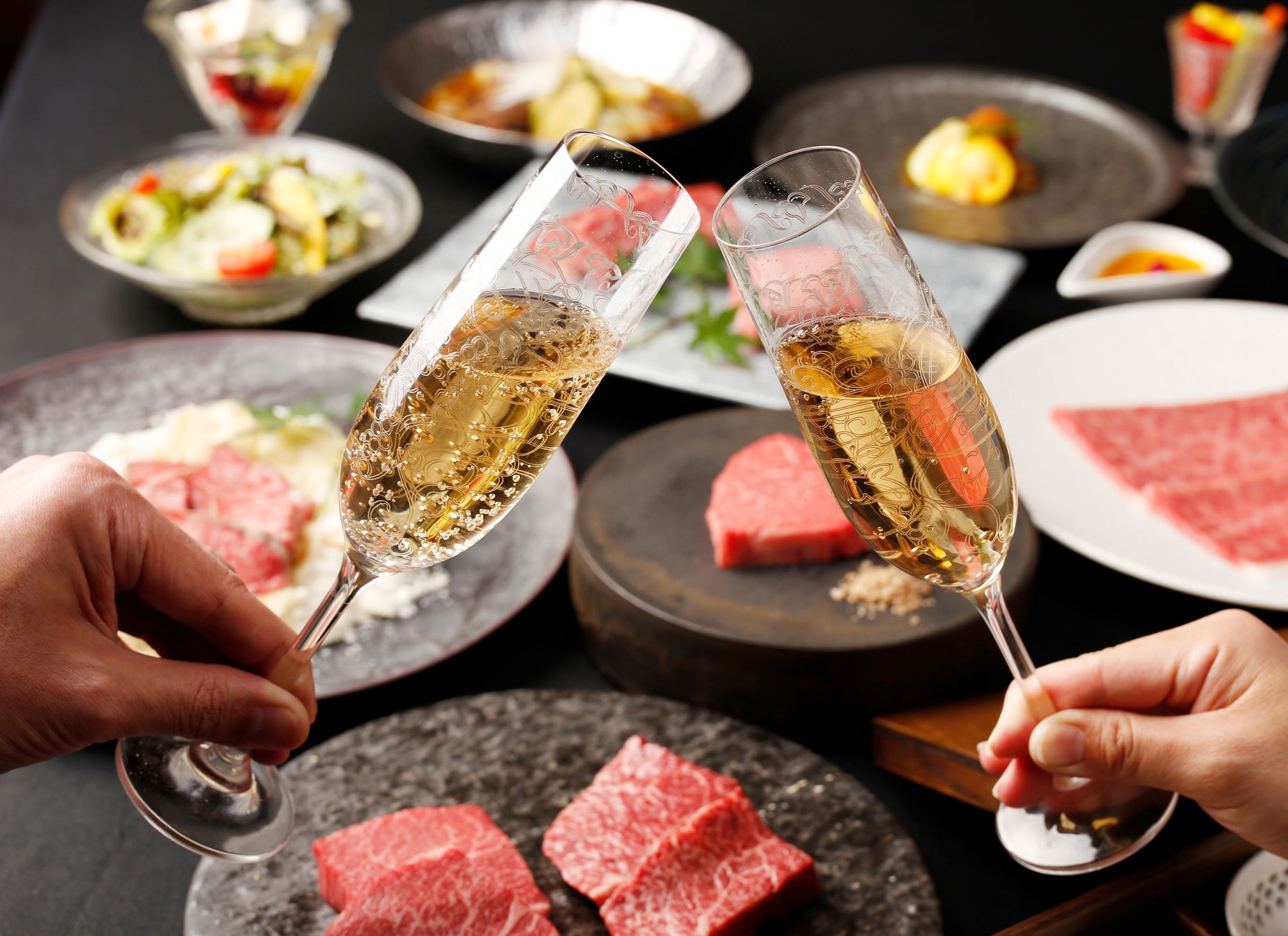 また、「達人コラボレーション」として、ソムリエが厳選したワインや、豊洲市場の理事長が目利きした海鮮とのペアリングもご用意。和牛の魅力をさらに引き立てる、上質なラインナップを取り揃えています。最高品質の素材と真摯なこだわりで、お客様に至福のひとときをご提供いたします。
