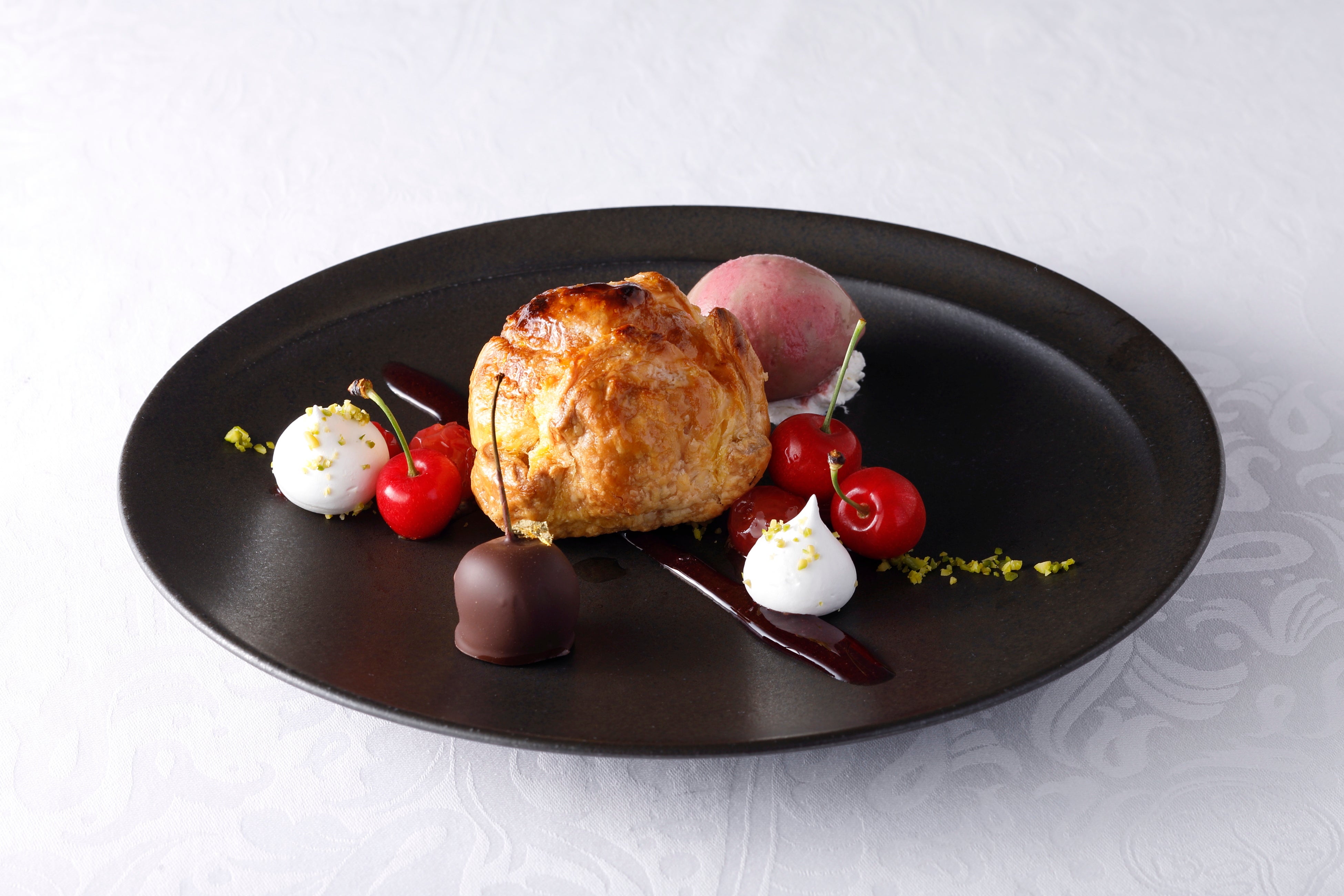 温かいパイの中に、フレッシュの佐藤錦とそのコンフィチュール、相性の良いチョコレートクリームを閉じ込めました。サクサクとしたパイの食感と、とろけるようなコンフィチュールのハーモニーをお楽しみください。