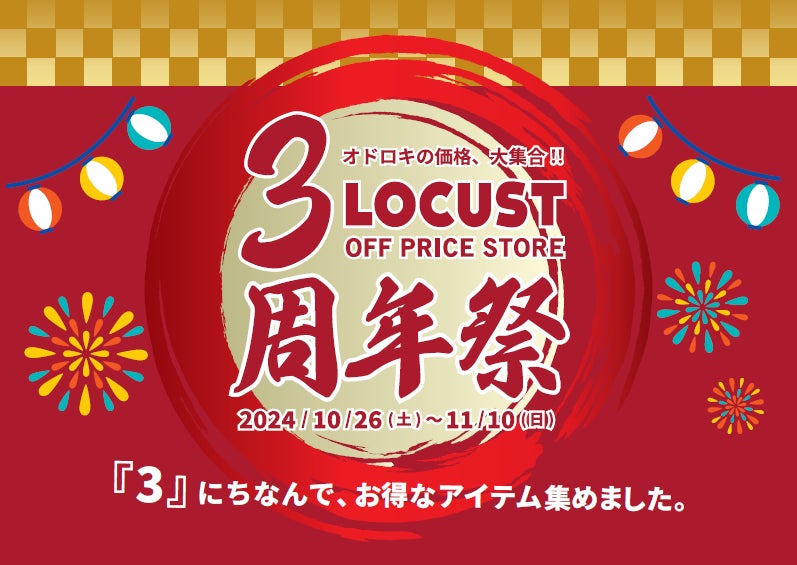 LOCUST(ローカスト)は24年度10月末に3周年を迎えます。お客様からのご愛顧に対する感謝の気持ちを込めて、10月26日(土)~11月10日(日)の2週間、3周年祭を開催いたします。