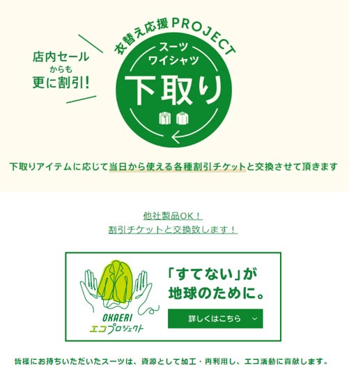 株式会社AOKI(代表取締役社長:森裕隆)が展開する『ORIHICA(オリヒカ)』は、不要なスーツや礼服を回収する「下取りプロジェクト」をこれまで期間限定で実施していましたが、環境への配慮とお客様のニーズに応えるため、2024年5月より、年間を通じて実施することといたしました。回収した衣類は「OKAERIエコプロジェクト」を通じてリサイクルし、ファッションロスの削減と資源の有効活用の推進に努めてまいります。