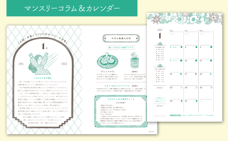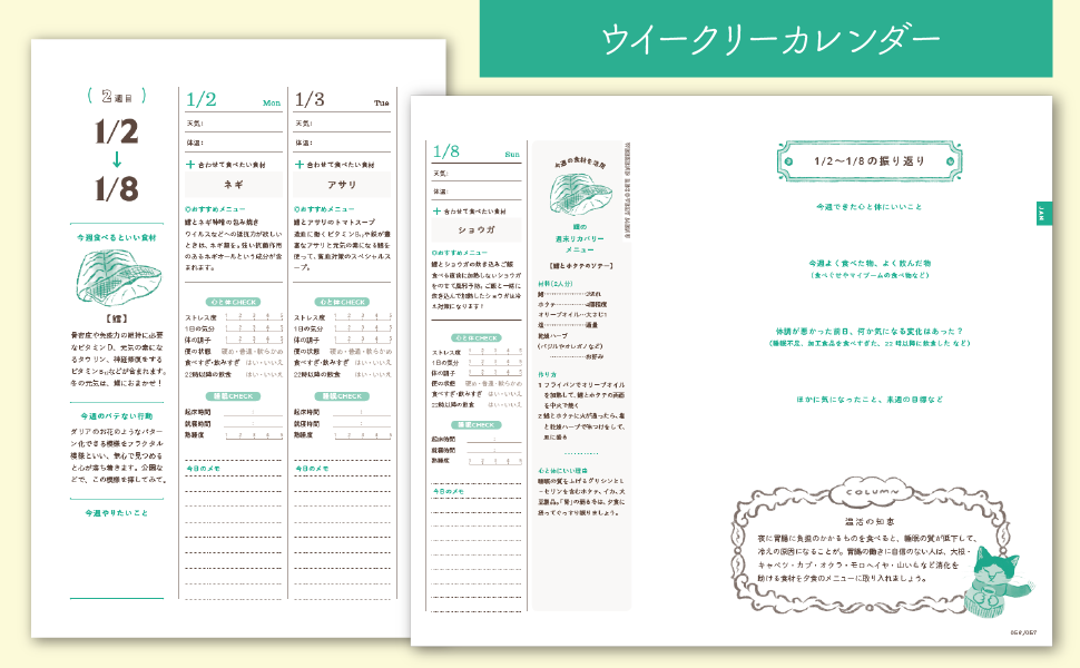 毎日の心と体の調子をチェックして振り返りつつ、季節に合わせて何を食べると心と体が健康になるのかがわかる手帳です。