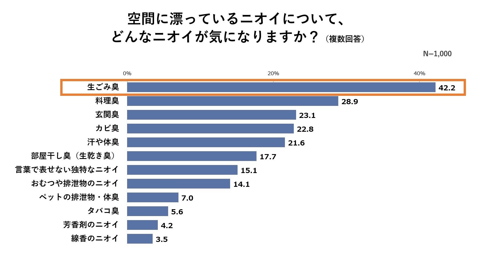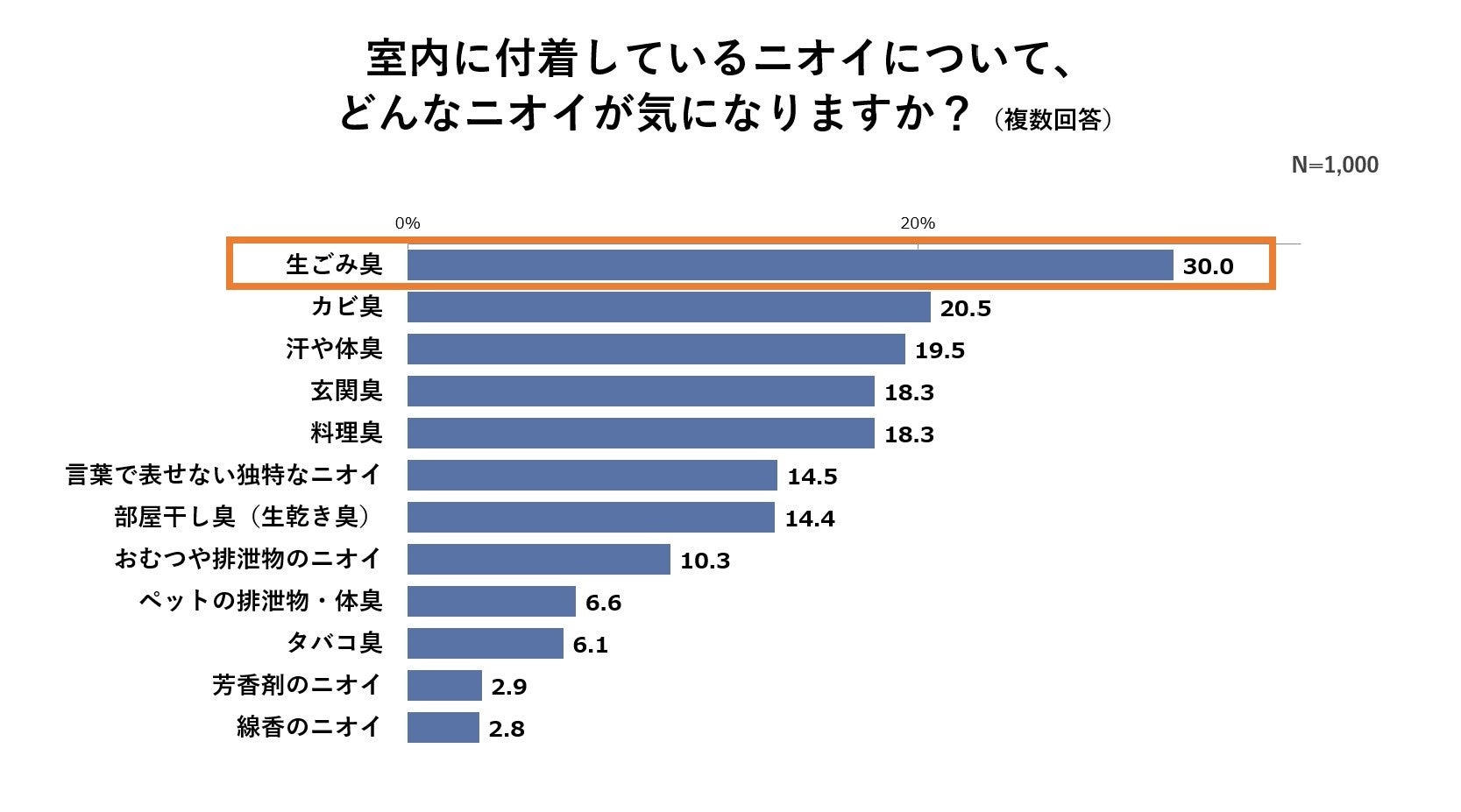 また、「(家庭内で)空間に漂っているニオイについて、どんなニオイが気になりますか?」と聞いたところ、1位は「生ごみ臭」(42.2%)となっており、さらに「(家庭内で)室内に付着しているニオイについて、どんなニオイが気になりますか?」と聞いたところ、こちらも1位が「生ごみ臭」(30.0%)という結果に。「生ごみ臭」は家庭内で最も気になるニオイであることが明らかになりました。