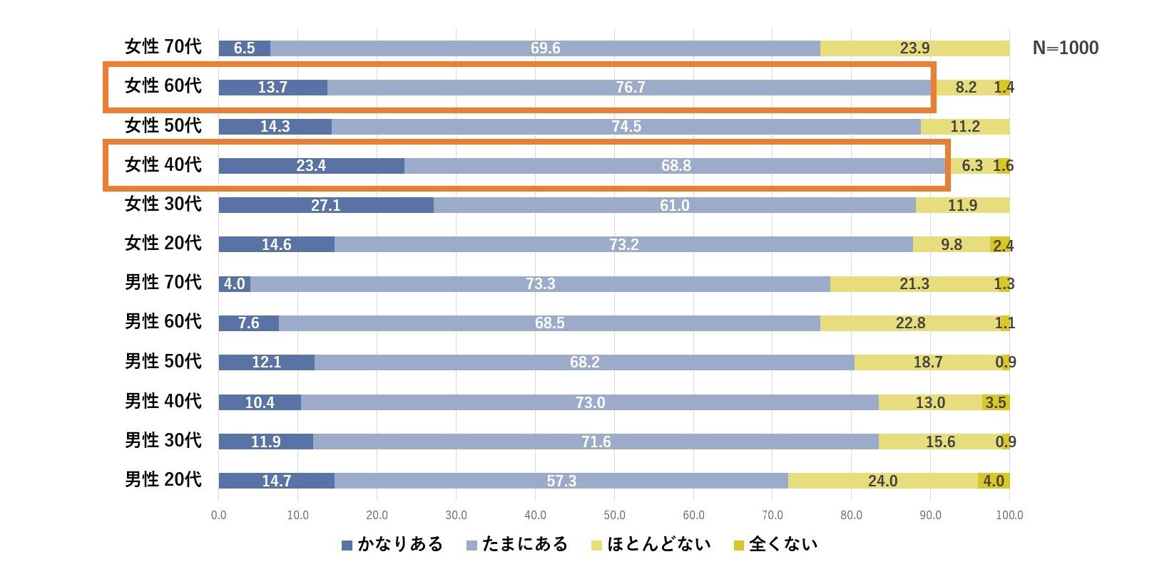 中でも「かなりある」「たまにある」を合わせた数字が最も大きいのは女性40代で92.2%、女性60代が90.4%という結果から女性の方がおうちでのニオイが気になっていることがわかります。一方、「ほとんどない」「全くない」を合わせた数字が最も大きいのは男性20代の28.0%となり、男女のニオイへの意識の差が浮き彫りになる結果となりました。