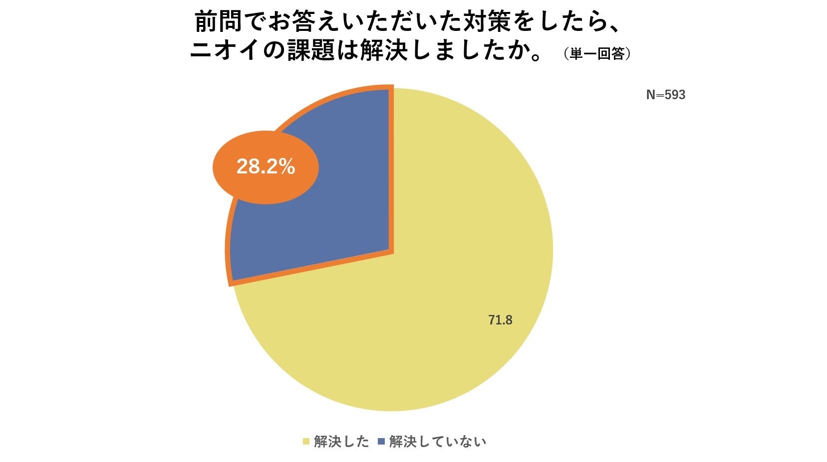 さらに半数以上が「消臭スプレーをかける」対策を実施。しかし、4人に1人は対策をしてもニオイの課題が解決していないと感じている結果に。